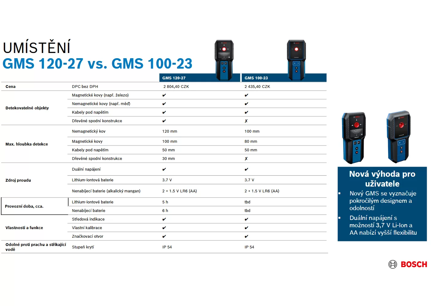 GMS 100-23 Professional vám pomůže detekovat a lokalizovat kovy a vodiče pod napětím ve stěnách. Lokalizace objektů ve stěně před vrtáním zajišťuje větší bezpečnost při práci, a to zejména pro řemeslníky při renovačních pracích, při věšení skříněk, kuchyňských linek, umyvadel, bojlerů a topných soustav nebo při montáži klimatizace či protipožárních systémů.