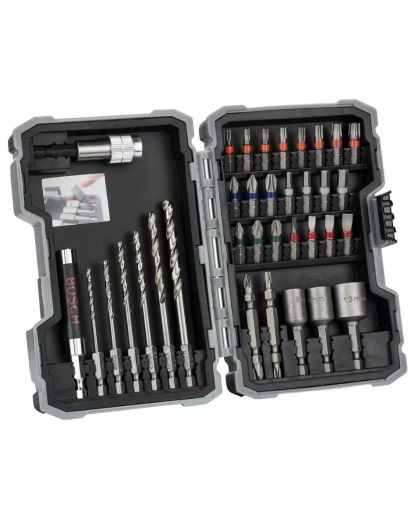 35dílná sada vrtáků a šroubovacích bitů Bosch 2607017326 Výrobní řada Příslušenství PRO Specifikace PH1; PH2; PH3; PZ1; PZ2; PZ3; SL3; SL4; SL5; SL6; H3; H4; H5; H6; T10; T15; T20; T20; T25; T27; T30; T40 35dílná sada vrtáků a šroubovacích...