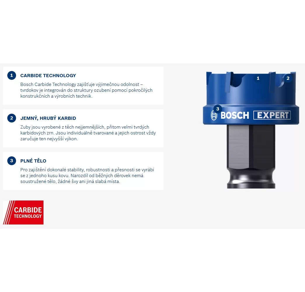 Bosch Carbide Technology zajišťuje výjimečnou odolnost – tvrdokov je integrován do struktury ozubení pomocí pokročilých konstrukčních a výrobních technik.