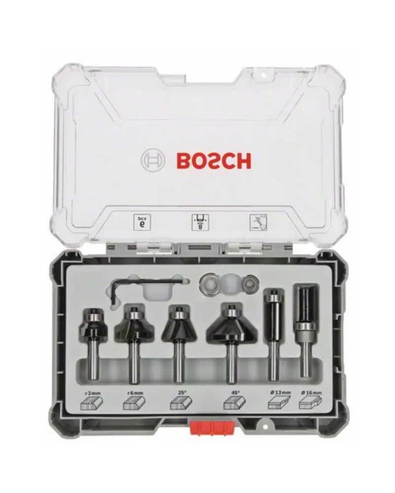 Sada ohraňovacích fréz s 8mm vřetenem Bosch 2607017469 Celková délka (G) mm 51 / 55 / 56 / 65 Pracovní délka (G) mm 10 / 13 / 16 / 25 … Celý popis