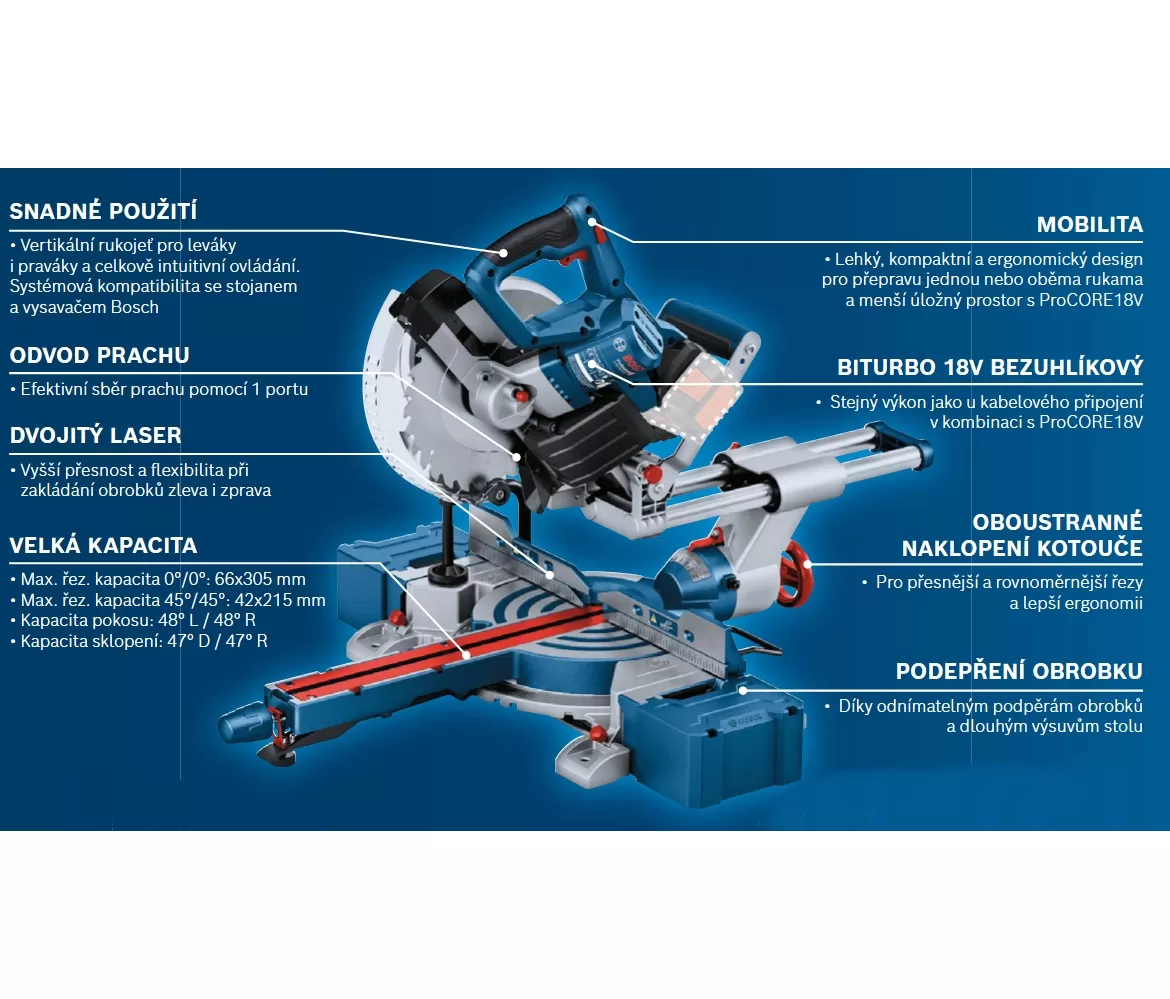 Aku pokosová pila 18V bez aku Bosch GCM 18V-216 D 0601B51000 Nový standard v otázce ergonomie: mobilní akumulátorová pokosová pila s řeznou kapacitou… Celý popis