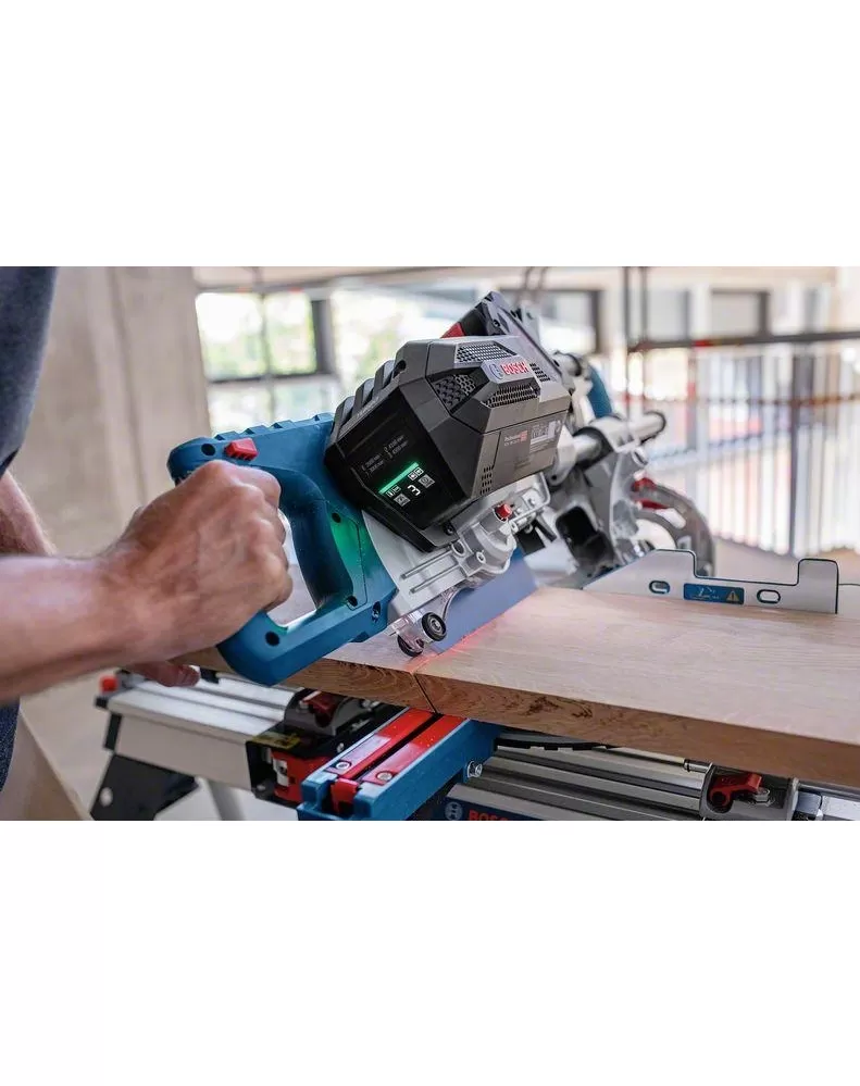 • Dlouhá verze, část 2 (BE) GCM 18V-216 DC se dokonale hodí na příčné, zkosené a pokosové řezy do masivních trámů a dřevěných kompozit i podlahových desek, hliníku a plastu.