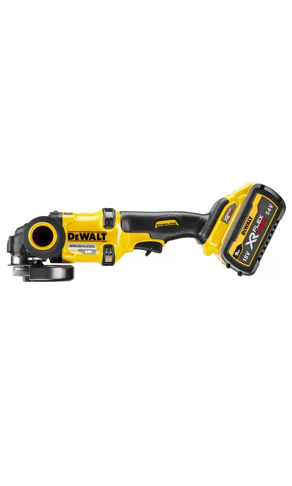 • Aku úhlová bruska 125mm 54V DeWALT DCG418 se zdokonaleným motorem, vysokým výkonem a elektronickou brzdou a spojkou.