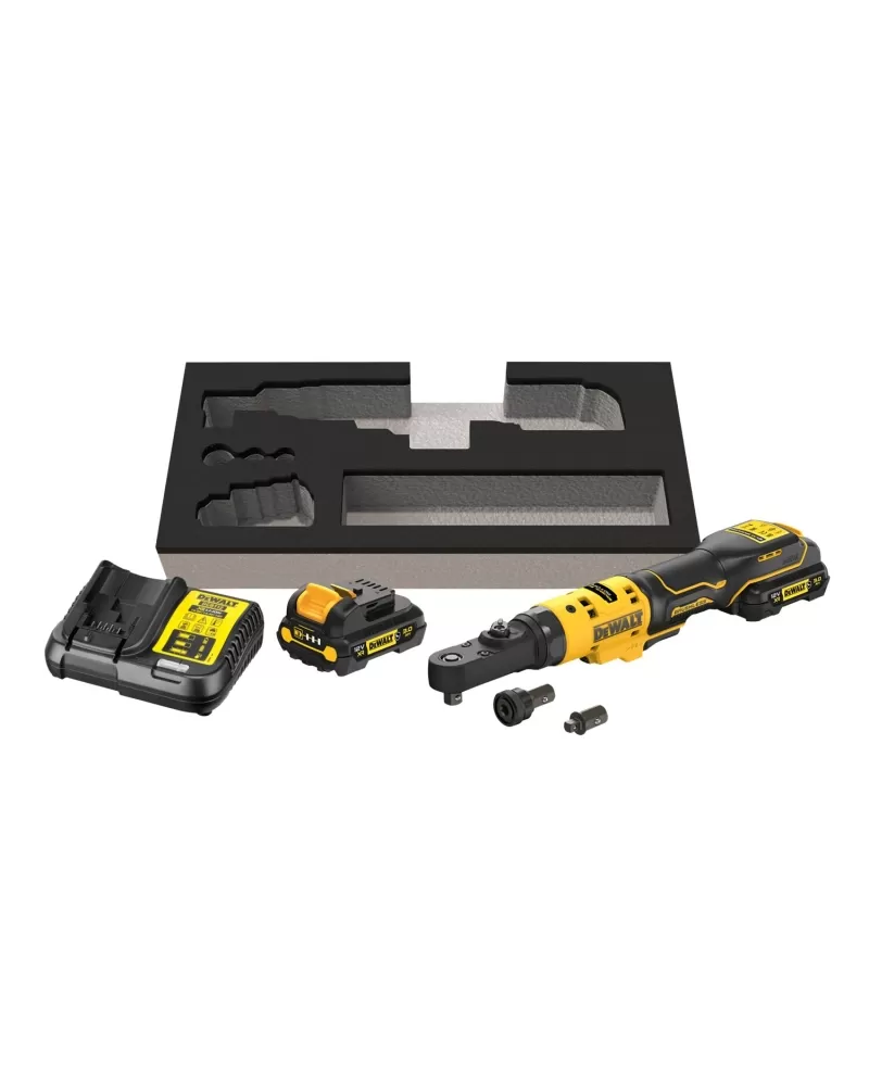 Akumulátorová račňa s 1/4'' + 3/8" štvorcovou vymeniteľnou hlavou a s 1/4" šesťhrannou vymeniteľnou hlavou 12V 2x3,0Ah DeWALT DCF500N