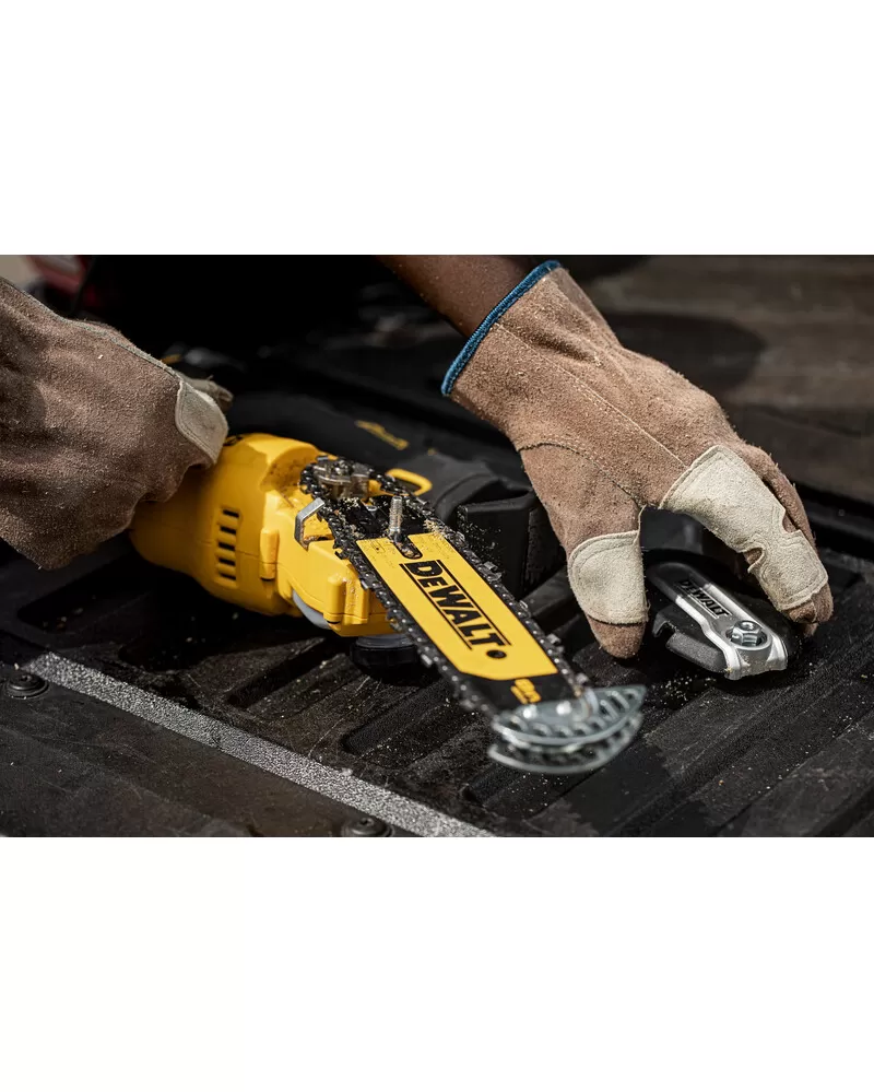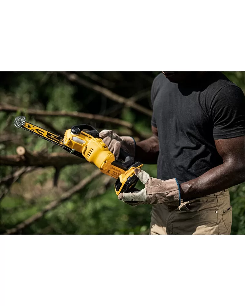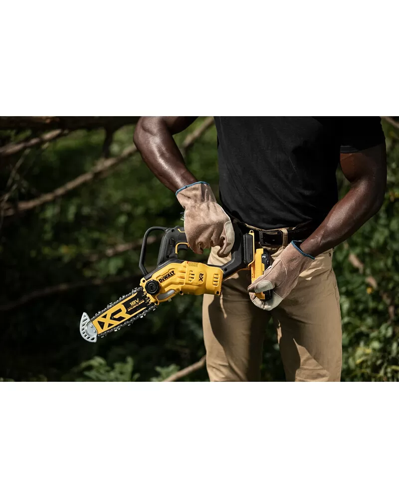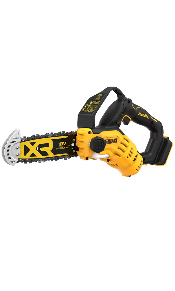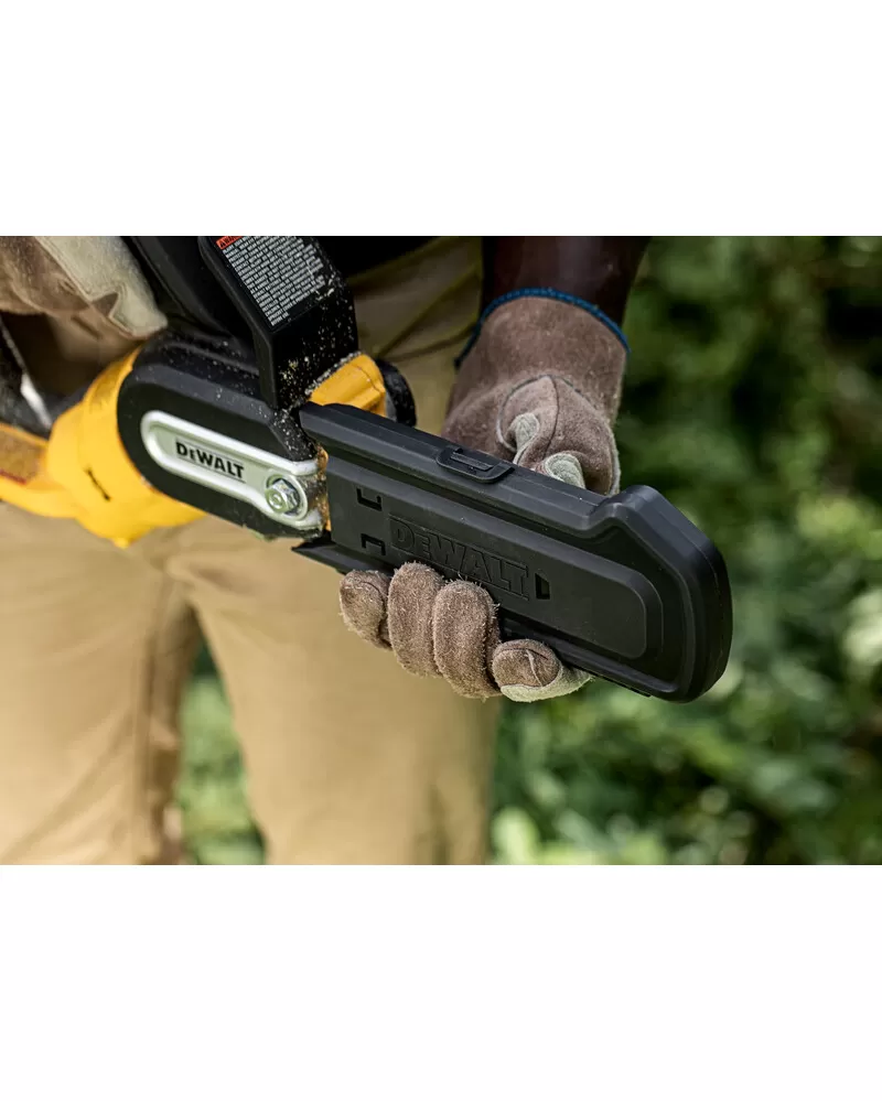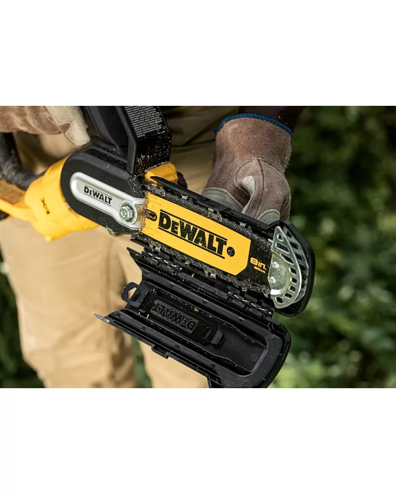 • Kompaktní design umožňuje snadný přístup do stísněných prostorů. Integrovaný ochranný kryt hrotu poskytuje stabilitu při provádění řezu ve směru zdola nahoru a klíč, který je uložen v integrovaném držáku, umožňuje rychlé a snadné napínání řetězu. Součást akumulátorového systému 18V XR.