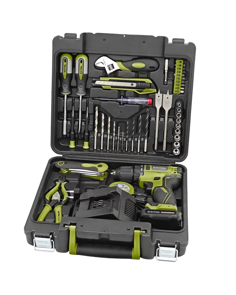 • Praktická sada pro domácnost obsahující aku vrtací šroubovák s vrtáky a bity a základní nářadí