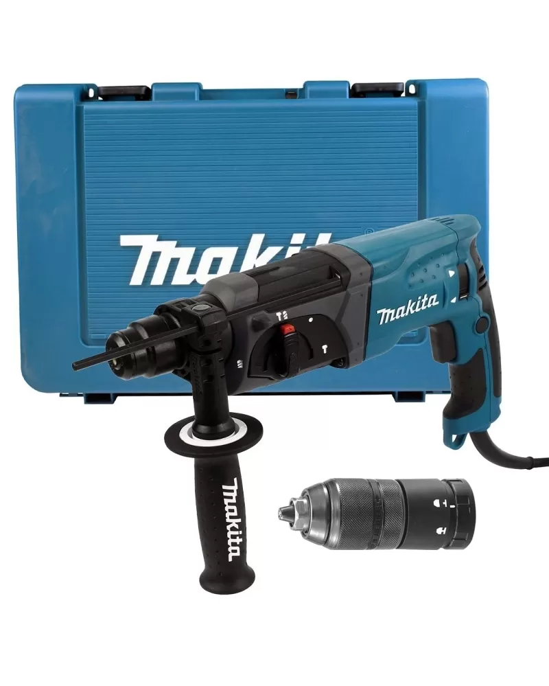 Profesionálne kombinované kladivo Makita na vŕtanie a sekanie. Kladivo je vybavené obmedzovačom krútiaceho momentu, ktorý chráni používateľa a stroj pred spätným rázom.