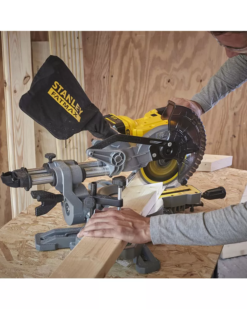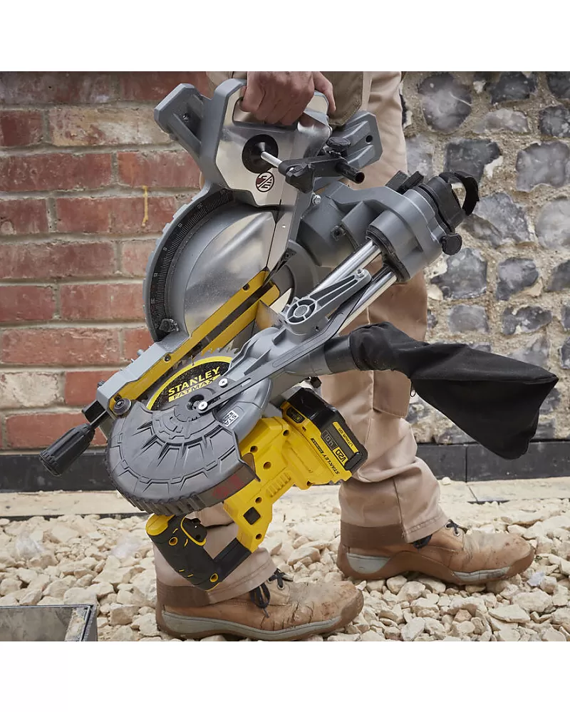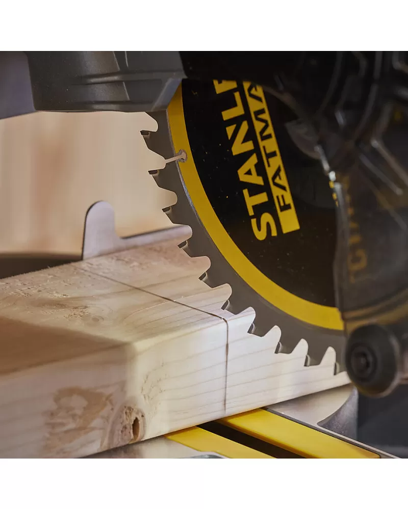 • Aku pokosová pila Stanley FatMax SFMCS701 s rozsahem pokosových řezů až 47° vlevo i vpravo a rozsahem šikmých řezů až 47° vlevo