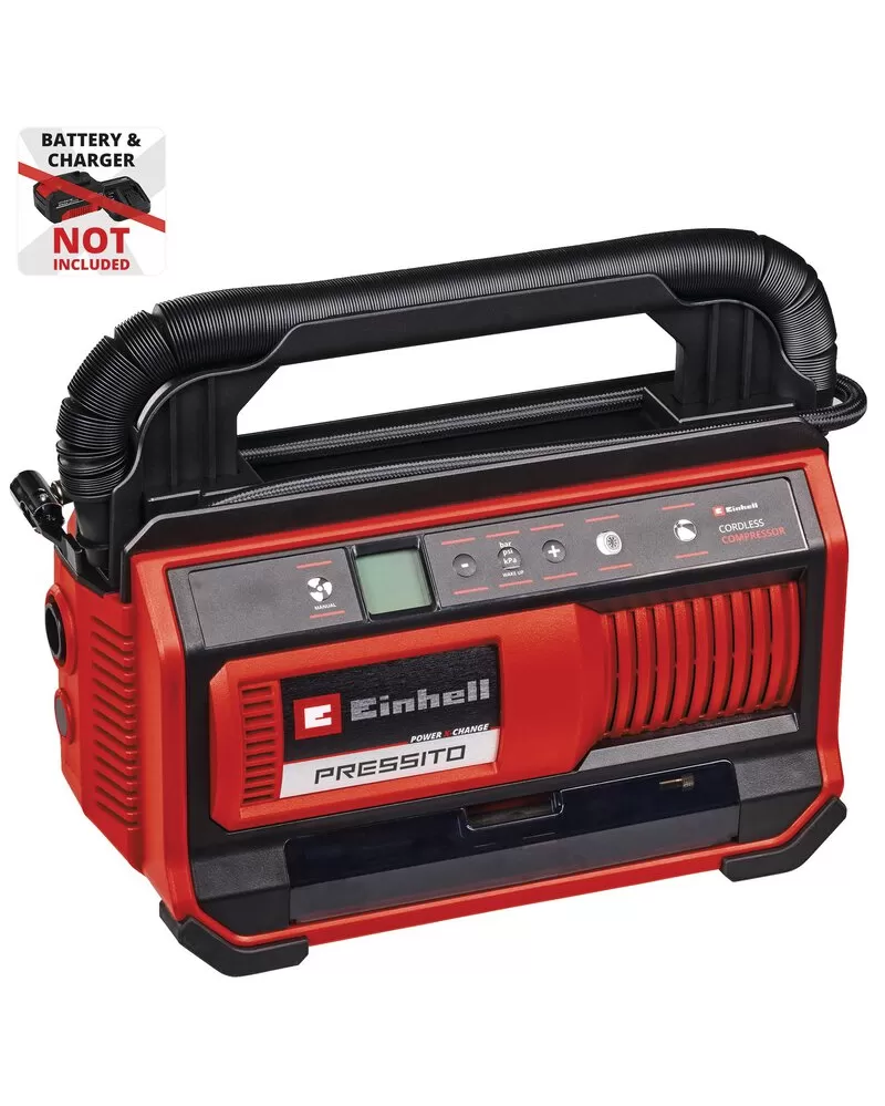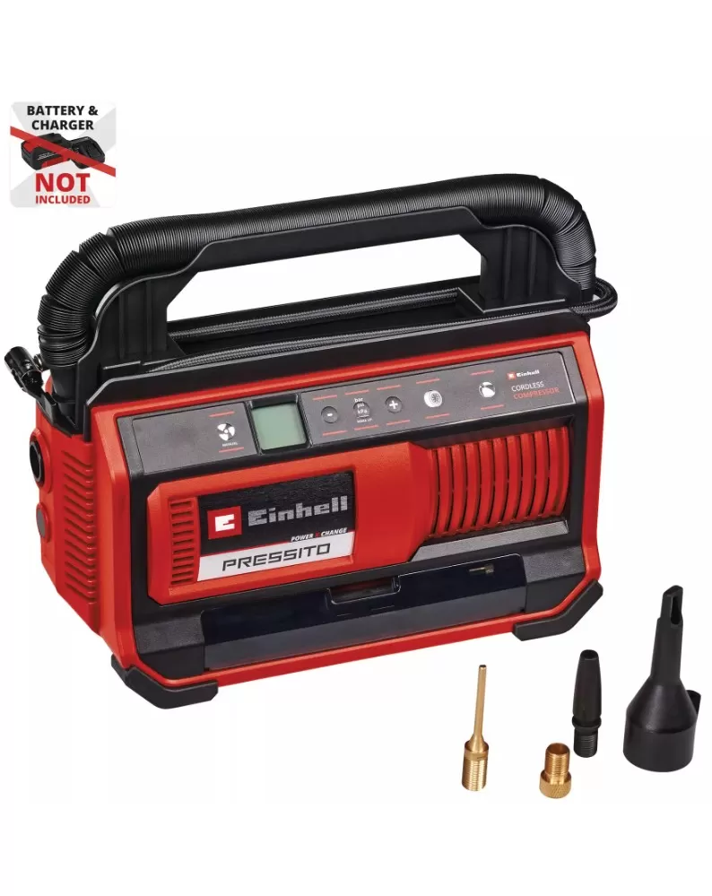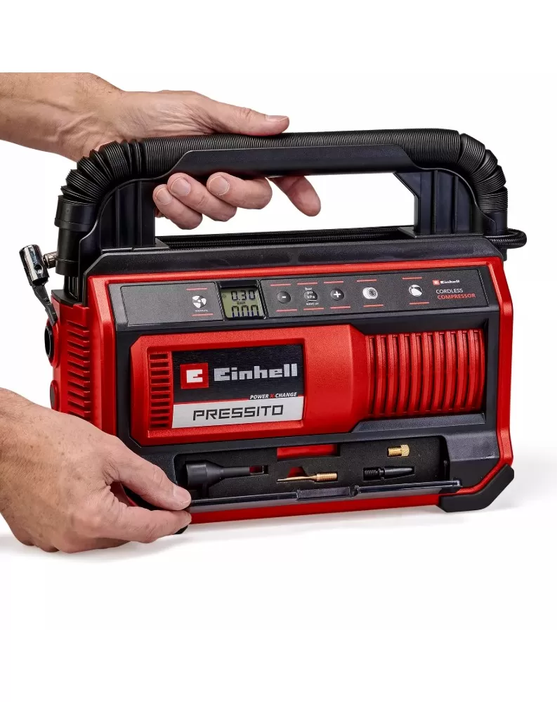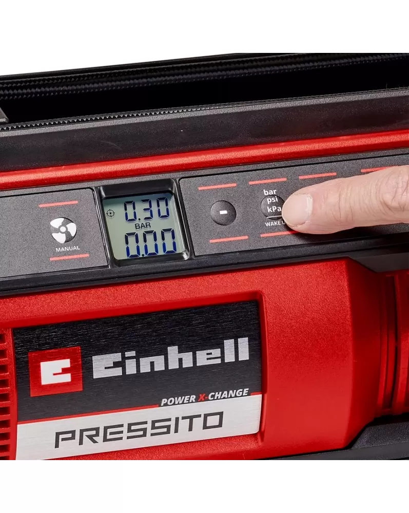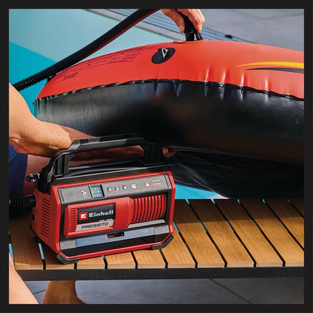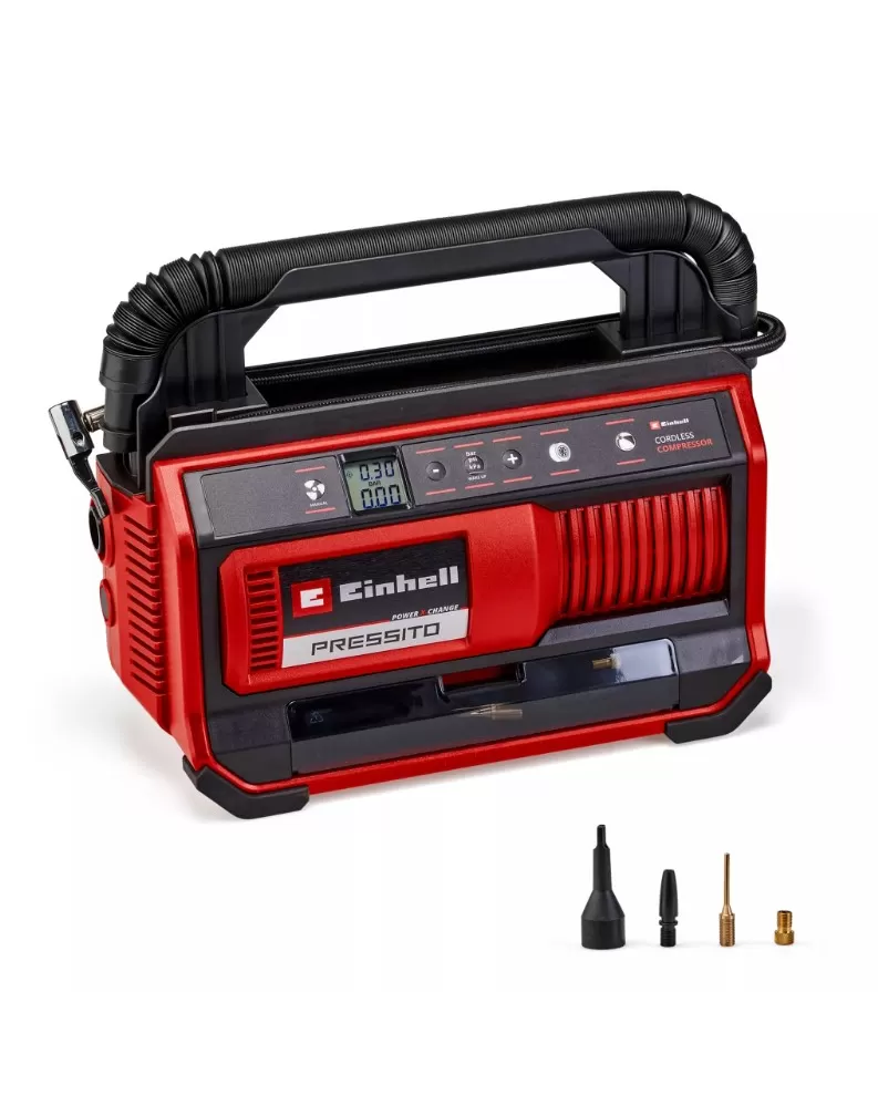Nedostatok vzduchu? Nie s akumulátorovým kompresorom Einhell PRESSITO 18/25: Je súčasťou výkonnej rodiny Power X-Change a je napájaný jednou 18 V systémovou batériou. Jeho vysokotlaková pumpa dosahuje až 11 barov a je ideálna na hustenie lôpt, bicyklov a pneumatík. Nízkotlakové čerpadlo zabezpečuje nafúknutie matracov alebo bazénov. Vzduch z nich potom možno vypustiť pomocou možnosti nízkotlakového nasávania. Dvojriadkový LCD displej dokáže odčítať aktuálny a cieľový tlak v baroch, psi alebo kPa. Po dosiahnutí požadovaného tlaku sa čerpadlo automaticky vypne. Manipuláciu navyše zjednodušuje tlačidlový spínač pre nafukovanie v rozsahu vysokého tlaku bez prednastavenia tlaku. Priložená 3-dielna sada adaptérov obsahuje ihlu, adaptér na pneumatiky a kužeľový adaptér. Adaptéry sú umiestnené v praktickom integrovanom úložnom priestore v kryte kompresora. Nedochádza k strate jednotlivých častí. Vysokotlakové a nízkotlakové hadice je možné umiestniť aj do integrovaných priehradiek, čo šetrí priestor. Praktická rukoväť a nízka hmotnosť robia z kompresora praktického spoločníka na cesty aj na doma. Dodávka neobsahuje batériu ani nabíjačku. Tie sú dostupné samostatne, napr. ako štartovacia súprava.