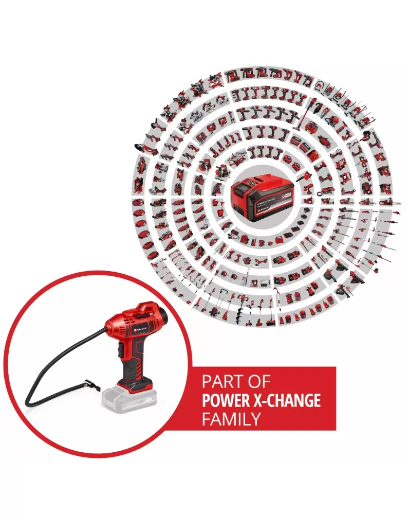 Akumulátorový autokompresor Einhell CE-CC 18 Li-Solo je obzvláště lehký a praktický kompresor, který je ideální pro drobné práce, jako je huštění pneumatik vozidel, jízdních kol nebo míčů. Jako člen jedinečné rodiny Power-X-Change lze tento automobilový kompresor kombinovat s každou dobíjecí baterií z vysoce výkonné produktové řady. Pro rychlé a snadné čtení aktuálního nastavení je akumulátorový kompresor do auta vybaven digitálním ukazatelem tlaku. Nastavení požadovaného tlaku na maximální hodnotu 11 bar je jednoduché. Po dosažení zvoleného tlaku se autokompresor automaticky vypne. Stisknutím tlačítka si můžete vybrat mezi hodnotami v bar, psi a kpa. Manuální huštění je možné kdykoliv bez předvolby. 3dílnou sadu nafukovacích adaptérů lze uložit přímo na kompresor. Pro větší pohodlí při používání slouží ergonomická rukojeť. Pro flexibilní dosah je k dispozici 60 cm hadice na stlačený vzduch s ventilkem na pneumatiky. Tento produkt je dodáván bez baterie a nabíječky; tyto položky jsou k dispozici samostatně, např. jako praktická startovací sada v různých výkonostních třídách.