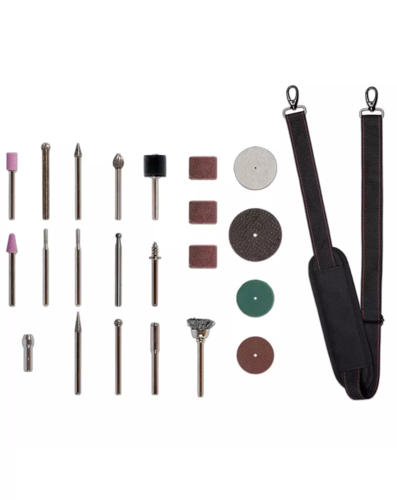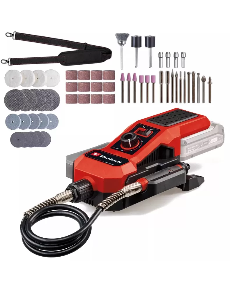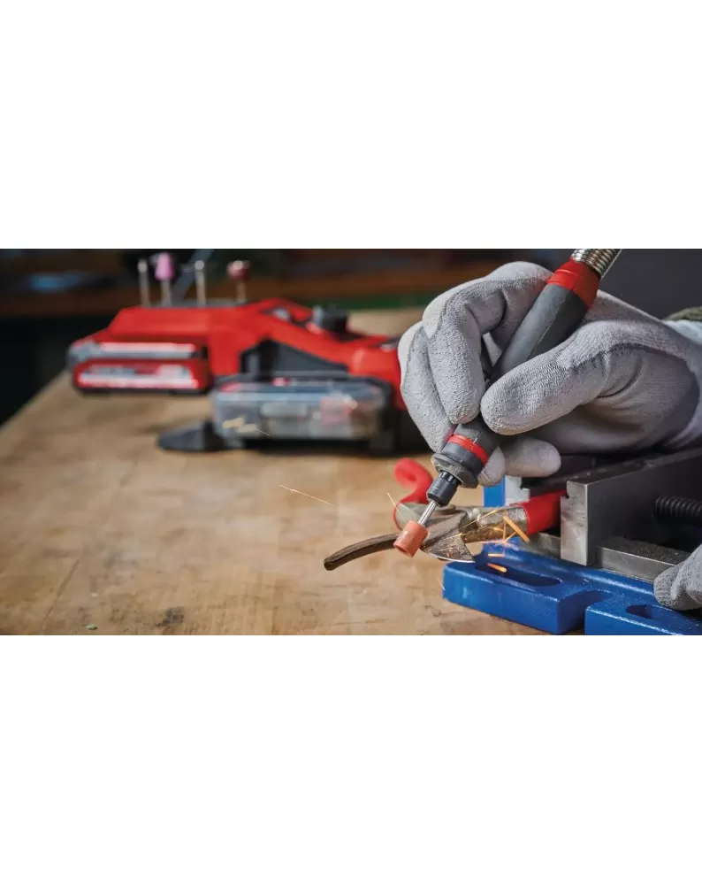 Akumulátorový přístroj na broušení a gravírovaní Einhell TE-MT 18/34 Li-Solo je praktickým pomocníkem pro řadu nejrůznějších úkolů, jako je gravírování, leštění, frézování, broušení, řezání a kartáčování. Akumulátorový přístroj na broušení a gravírování je součástí rodiny Einhell Power X-Change, v níž lze všechny akumulátory, nabíječky a systémové nástroje vzájemně flexibilně kombinovat. Elektronika s plynulou regulací otáček umožňuje přizpůsobit výkon každé situaci a každému materiálu - při otáčkách od 5 000 do 34 000 za minutu. Aretační tlačítko umožňuje rychlou a snadnou výměnu nástrojů. Přesné výsledky i při detailních úkolech nebo složitém rytí umožňuje pero na 92 cm dlouhé ohebné hřídeli. Gravírovací pero dokonale padne do ruky díky štíhlému designu s měkkými úchopovými plochami. Brusná a gravírovací stanice je vybavena praktickým držákem nástavce a pera, dále držákem na často používané příslušenství a odnímatelným boxem na příslušenství připevněným k pouzdru. V závislosti na úkolu lze stanici přenášet pomocí 150 cm dlouhého nosného popruhu, zavěsit pro úsporu místa pomocí nástěnného držáku nebo bezpečně umístit díky pogumovaným nožičkám. Součástí dodávky je také rozsáhlá 55dílná sada příslušenství, takže univerzálnímu použití všeho druhu se prakticky meze nekladou. Akumulátorový brusný/gravírovací přístroj TE-MT 18/34 Li-Solo se dodává bez akumulátoru a nabíječky. Ty jsou k dispozici samostatně, například jako praktická startovací sada.