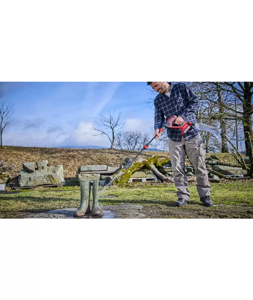 Akumulátorová tlaková pištoľ Einhell HYPRESSO 18/24-1 umožňuje flexibilitu bez káblov pri upratovaní a polievaní okolo záhrady a terasy. Batériová tlaková pištoľ je súčasťou série Power X-Change, kde je možné flexibilne kombinovať batérie a systémové zariadenia. Aku vysokotlakový čistič pracuje pri tlaku 24 barov a prietoku 240 litrov vody za hodinu. Režim ECO znamená, že životnosť batérie možno predĺžiť stlačením tlačidla. Striekacia pištoľ je vybavená štvorcestnou nastaviteľnou tryskou. Má úzke a široké trysky, ako aj rozprašovaciu trysku na polievanie a rotačnú trysku na čistenie odolných nečistôt. Vysokotlakovú čistiacu pištoľ je možné pripojiť nielen priamo do záhrady cez hadicovú prípojku, ale vďaka vodnému filtru a 5 metrovej sacej hadici dokáže naberať vodu aj z vedier, kanistrov či jazierok. Súčasťou balenia je adaptér na fľašu, ktorý umožňuje pri cestovaní používať vodu zo štandardných PET fliaš. Súprava tiež obsahuje dva predlžovacie nástavce, penovú sprejovú fľašu ideálnu na umývanie auta a sieťovú tašku na uloženie príslušenstva. Okrem toho je súčasťou balenia aj kryt proti postriekaniu vodou, ktorý jednoducho nasuniete na batériu Power X-Change a umiestnite na ňu, čím získate dodatočnú ochranu pred postriekaním a vlhkosťou. Pištoľ HYPRESSO 18/24-1 je dodávaná bez batérie a nabíjacieho zariadenia. Tieto sú k dispozícii samostatne.
