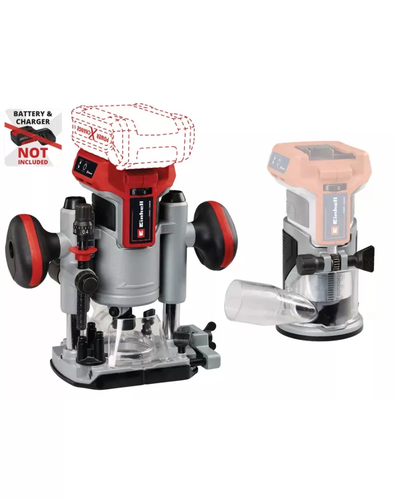 Aku vrchní ohraňovací frézka TP-RO 18 Set Li BL - Solo Einhell Professional je členem rodiny Power X-Change a nabízí svobodu bez kabelů. Zařízení je poháněno bezuhlíkovým motorem Einhell PurePOWER. Tento bezuhlíkový motor nabízí vyšší výkon a delší dobu chodu než běžné uhlíkové motory. Na bezuhlíkový motor je po online registraci poskytována 10letá záruka. Elektronika pro regulaci otáček v kombinaci s výkonným motorem se optimálně přizpůsobí každému úkolu v měkkém i tvrdém dřevě. Hloubka frézování je plynule nastavitelná s dodatečným jemným nastavením. Nastavení hloubky se provádí pomocí vícestupňového dorazu. Frézka je vybavena systém vodících lišt, kleštinovým sklíčidlem (6 a 8 mm) a aretací vřetena pro snadnou výměnu nástrojů. LED osvětlení zajišťuje optimální osvětlení pracovního prostoru. Plastová vložka chrání povrch obrobku. Rukojeť se softgripem, kryt, který chrání před třískami v zorném poli, a obouruční úchop pro přesné a bezpečné ovládání nástroje. Nástavec pro frézování hran umožňuje také zkosení hran. Součástí dodávky je paralelní doraz, kompasový hrot a nářadí, jakož i sací adaptér, vhodný pro mokrosuché vysavače Einhell. Baterie a nabíječka nejsou součástí dodávky. Ty jsou k dispozici samostatně, například jako praktický Starter-Kit.