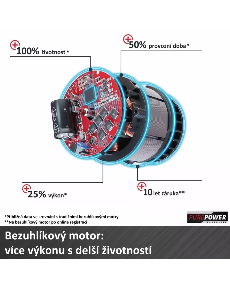 Bezuhlíkový motor PurePower zajišťuje nejvyšší výkon, delší dobu provozu a maximální životnost. Na rozdíl od motorů s uhlíkovými kartáči nepodléhá bezkartáčový motor opotřebení, a proto je bezúdržbový. Pokud je motor PurePower registrován online, je dodáván s 10letým servisním příslibem.