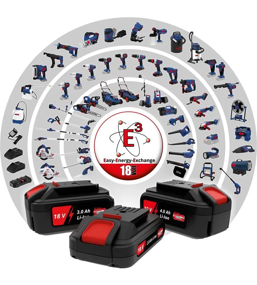 • 18 V lithium-iontový akumulátor, volně kombinovatelný s ručním nářadím řady 18V E3 AKKUSYSTEM-GRUPPE