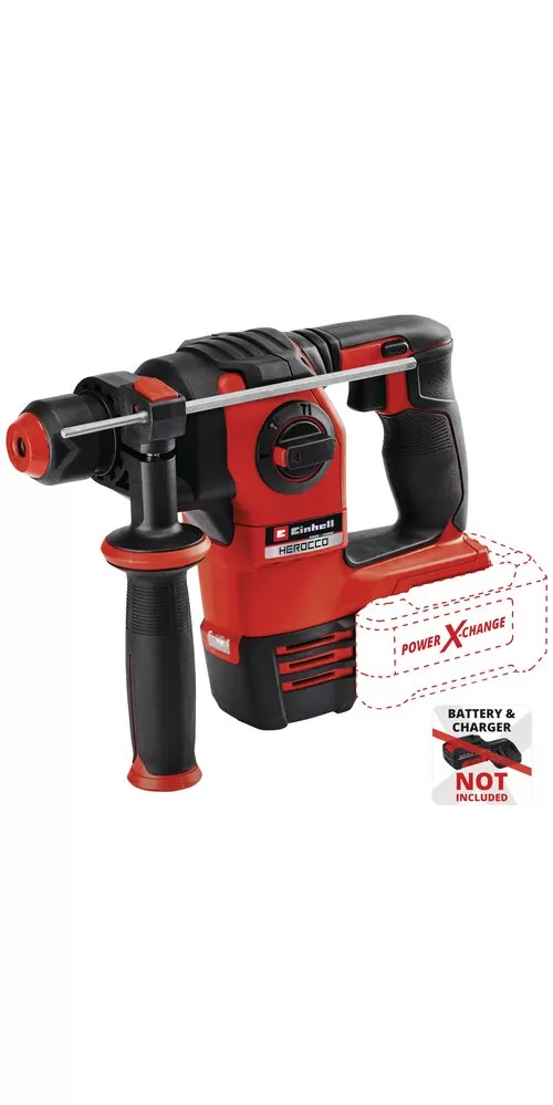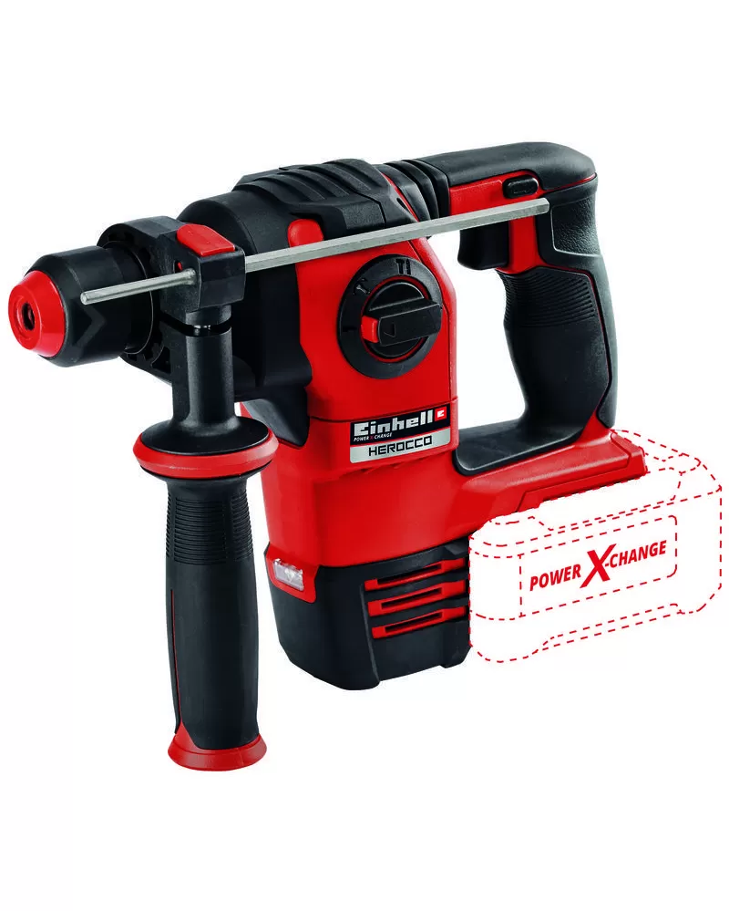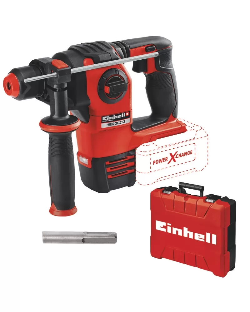 • Vrtací aku kladivo Einhell Herocco je vyhledávaný pomocník: Poskytuje spolehlivý výkon pro vrtání, vrtání s příklepem nebo sekání s fixací nebo bez fixace