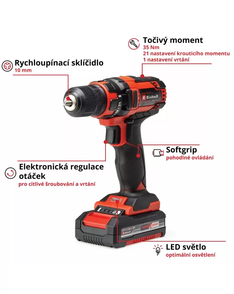 • Akumulátorová vŕtačka Einhell TC-CD 18/35 Li (1x1,5 Ah) je obľúbeným pomocníkom pri všetkých prácach v domácnosti, dielni alebo garáži a je členom inovatívnej rodiny Power X-Change