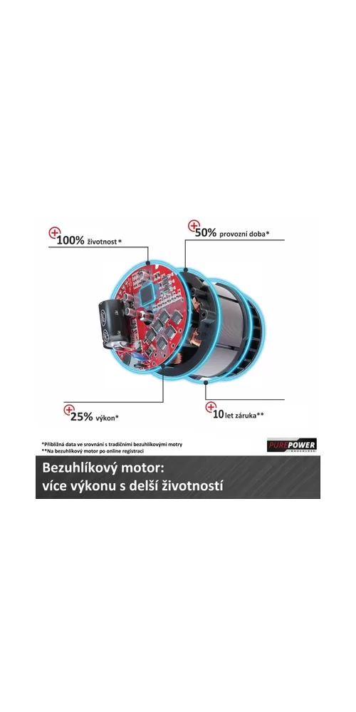 • Bezuhlíkový motor – větší výkon a delší provoz