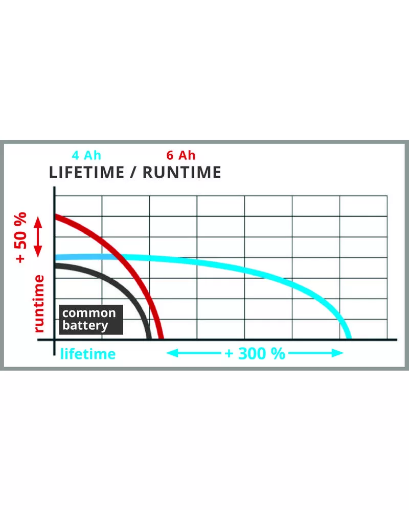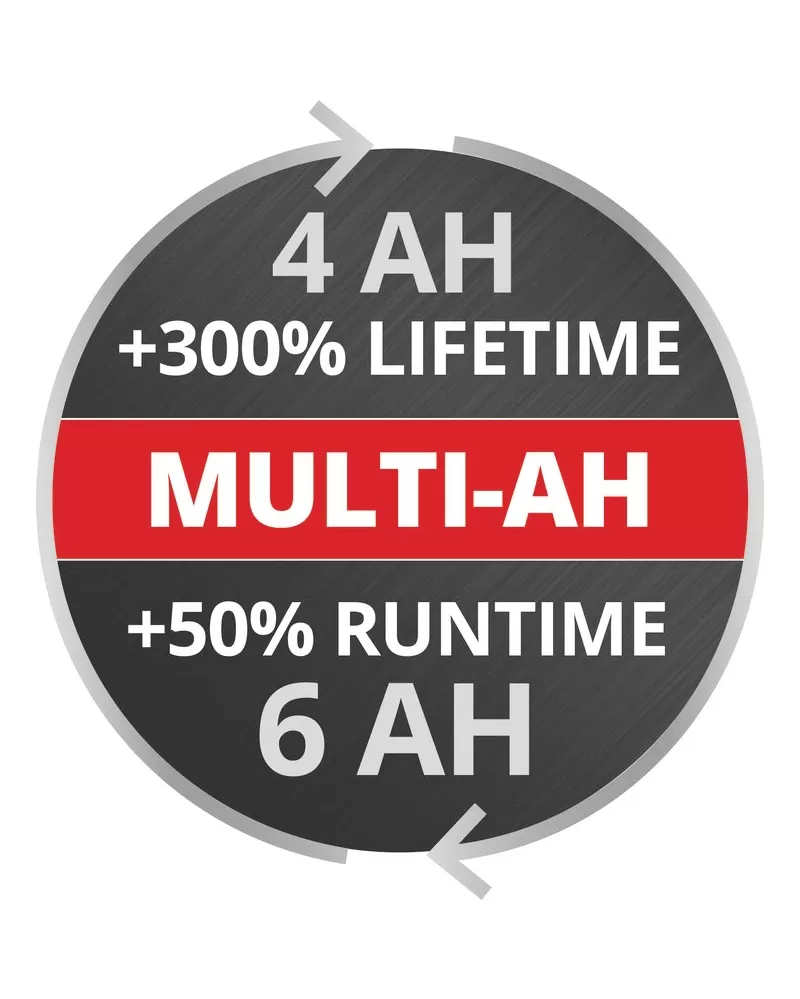 • Díky technologii MULTI-Ah jej lze provozovat jako 6Ah baterii pro maximální výdrž a jako 4Ah baterii pro 3x delší celkovou životnost
