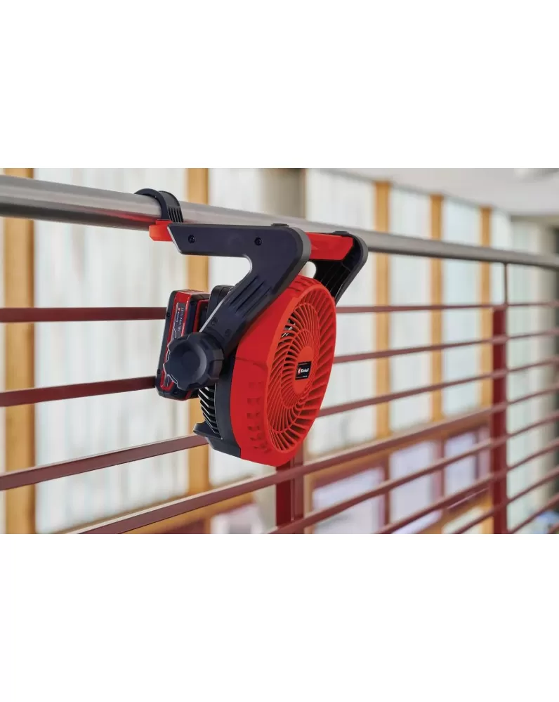 S pomocí integrovaného upevňovacího háku lze aku ventilátor snadno zavěsit například na ploty.