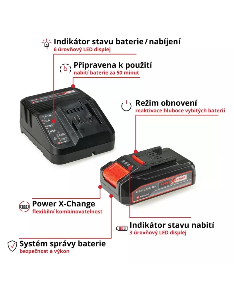 • Startovací sada s 18V 2,5 Ah dobíjecí baterií Power X-Change PLUS a vysokorychlostní nabíječkou baterií je členem multifunkčního a neomezeně kombinovatleného systému dobíjecích baterií Power X-Change od společnosti Einhell