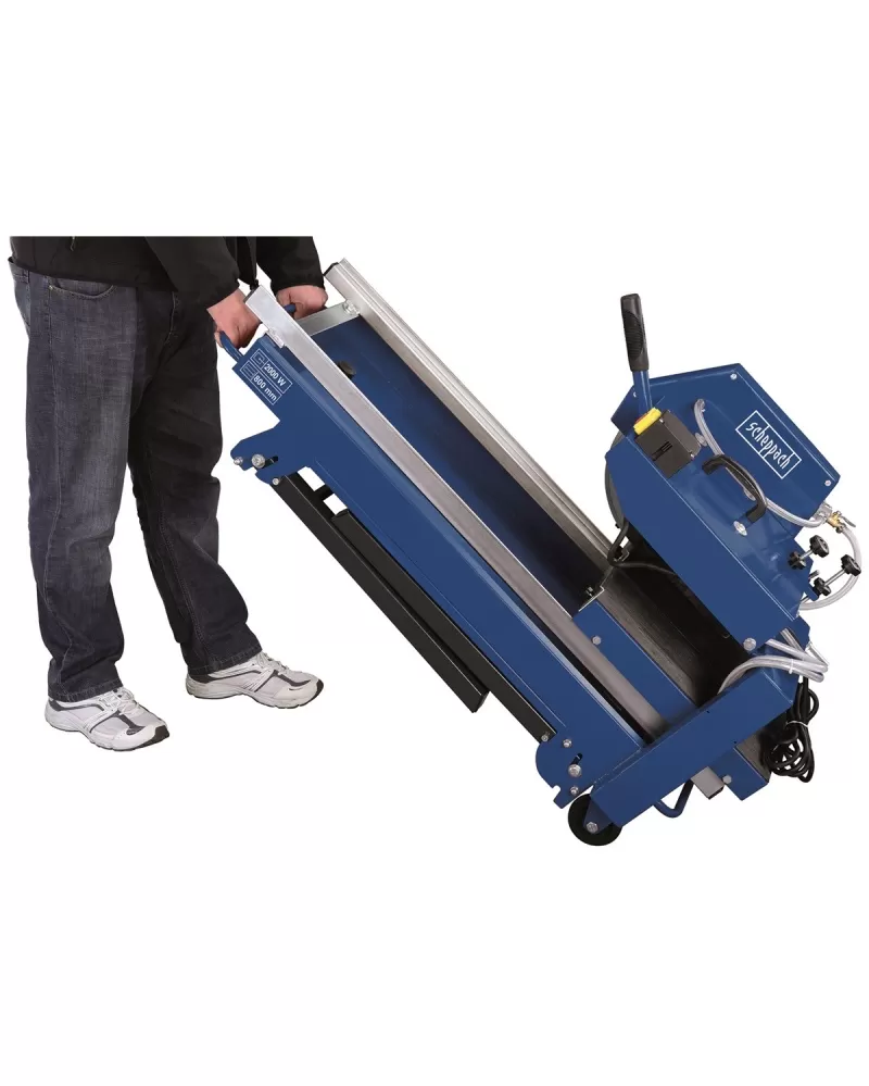 • Výkonný 2200 W motor s tepelnou ochranou si hravo poradí s rezaním keramických dlaždíc, žuly, mramoru, tehál atď. Hlavnou výhodou je veľká dĺžka rezu 700 mm po hrane (alebo 535 mm diagonálne), čo umožňuje tejto rezačke pracovať aj s veľmi obľúbenými veľkoformátovými dlaždicami. Fréza je vybavená kvalitným diamantovým kotúčom s priemerom 360 mm určeným pre mokré rezy. Rezaciu hlavu je možné plynule nastaviť v uhle od 0° do 45°. Pracovný stôl je vybavený pojazdnými kolieskami s ložiskami, ktoré umožňujú veľmi plynulý pohyb. Stolík je vybavený protišmykovou pogumovanou vrstvou a presným uhlovým a pozdĺžnym dorazom so stupnicou. Vodné chladenie rezacieho kotúča a bezprašnú prácu zabezpečuje integrované čerpadlo. Výhodou je aj veľká nádrž na vodu. Stroj je vybavený najmodernejšou bezpečnostnou ochranou proti úrazu elektrickým prúdom a zásuvka je vybavená aj prepäťovou ochranou. Pre jednoduchú prepravu je stroj vybavený kolieskami a skladacou základňou.