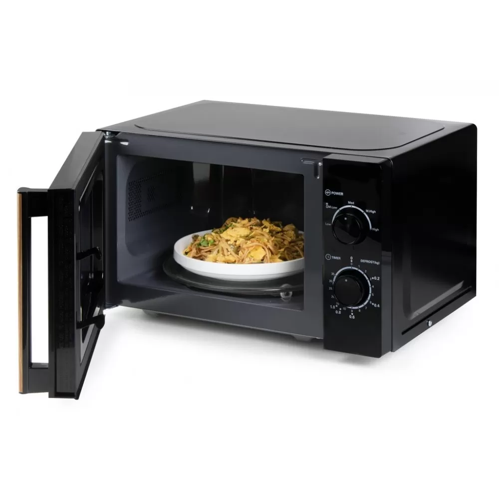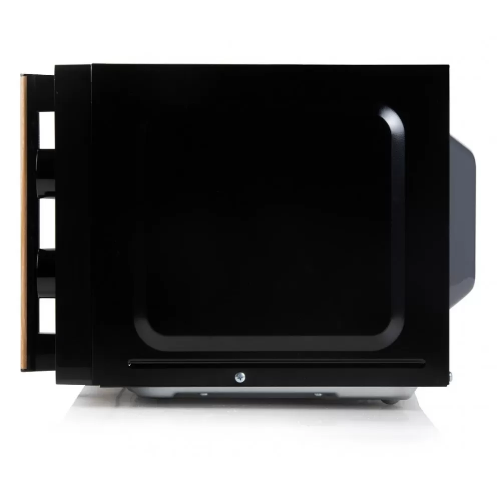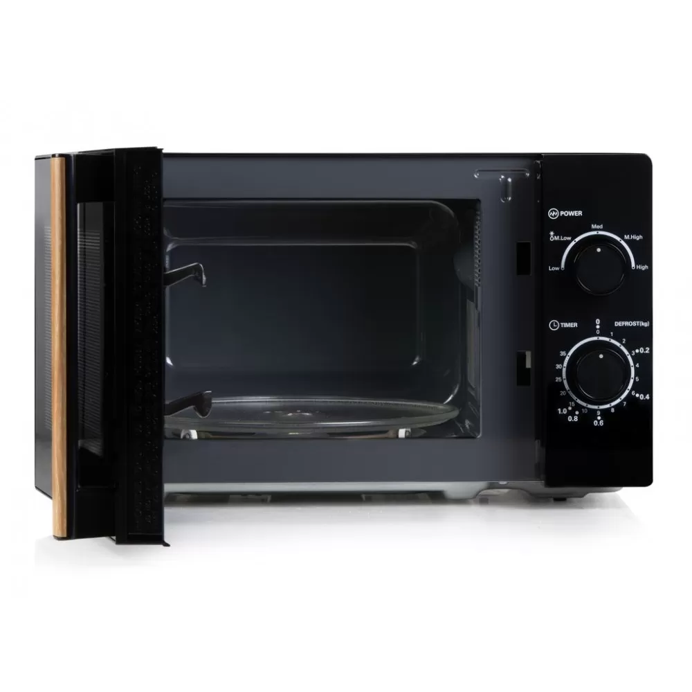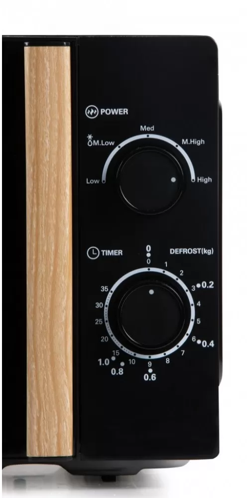 Mikrovlnná trouba s manuálním ovládáním v černé barvě s dřevěným dekorem na rukojeti. Velmi jednoduchá na ovládání a používání.