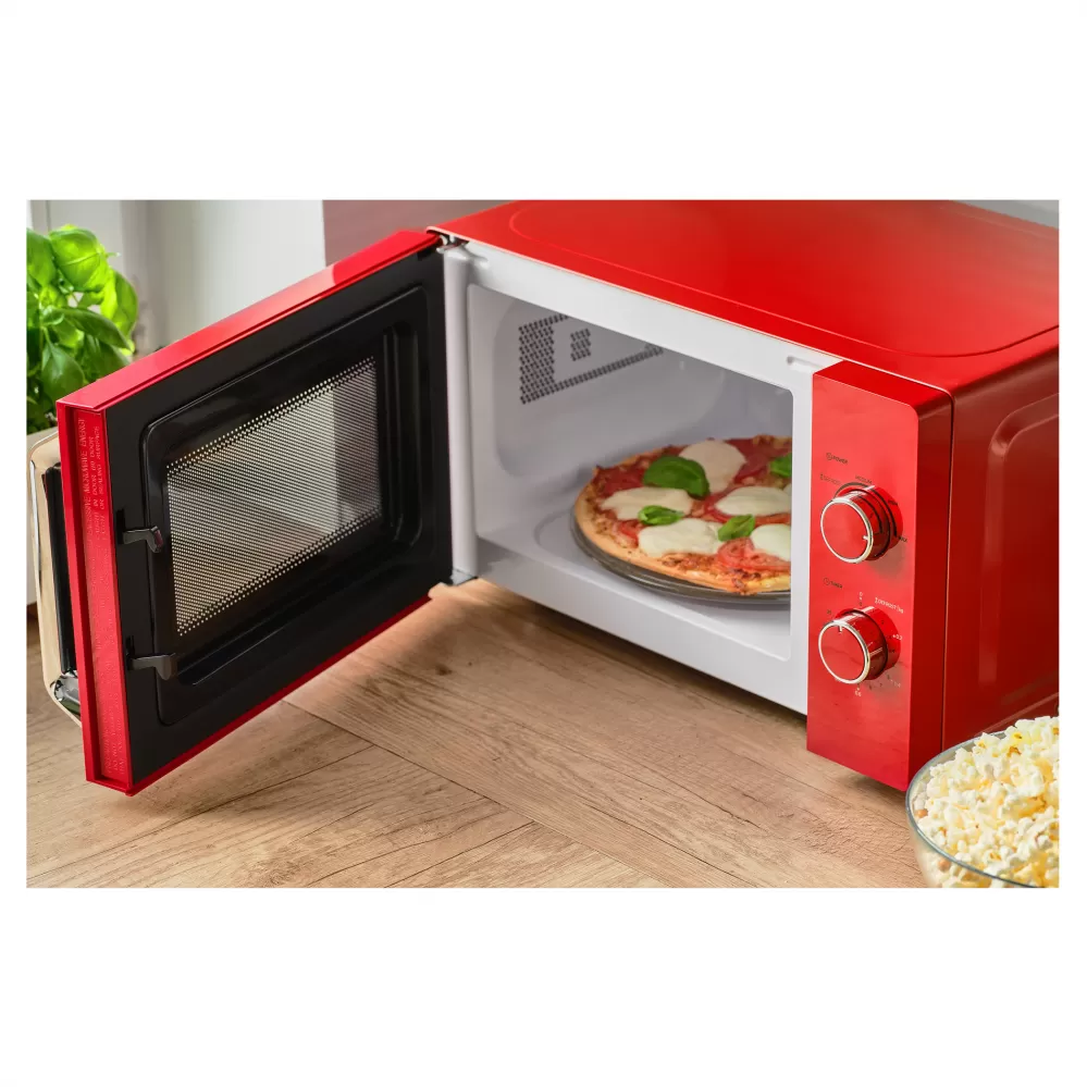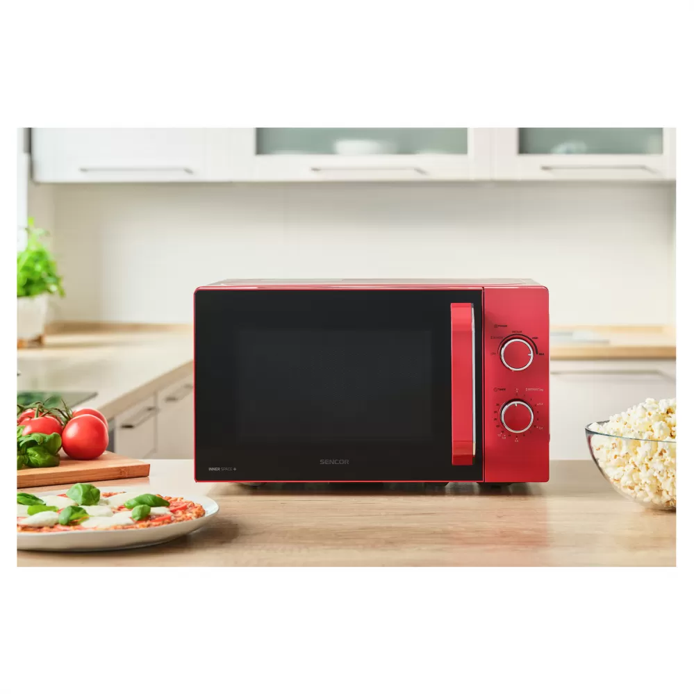 Mikrovlnná trouba SMW 1920RD s jednoduchým manuálním ovládáním a stylovým červeným designem se hodí do kuchyně, kanceláře a všude tam, kde je potřeba rychle ohřát či rozmrazit potraviny. Trouba má vnitřní objem 20 litrů a disponuje otočným talířem na který se vejdou i větší misky o průměru až 25,5 cm. Pomocí dvou otočných knoflíků si jednoduše zvolíte jednu z pěti úrovní výkonu a nastavíte 35minutový časovač. Interiér trouby je opatřen enamelem, který velmi usnadňuje čištění spotřebiče.