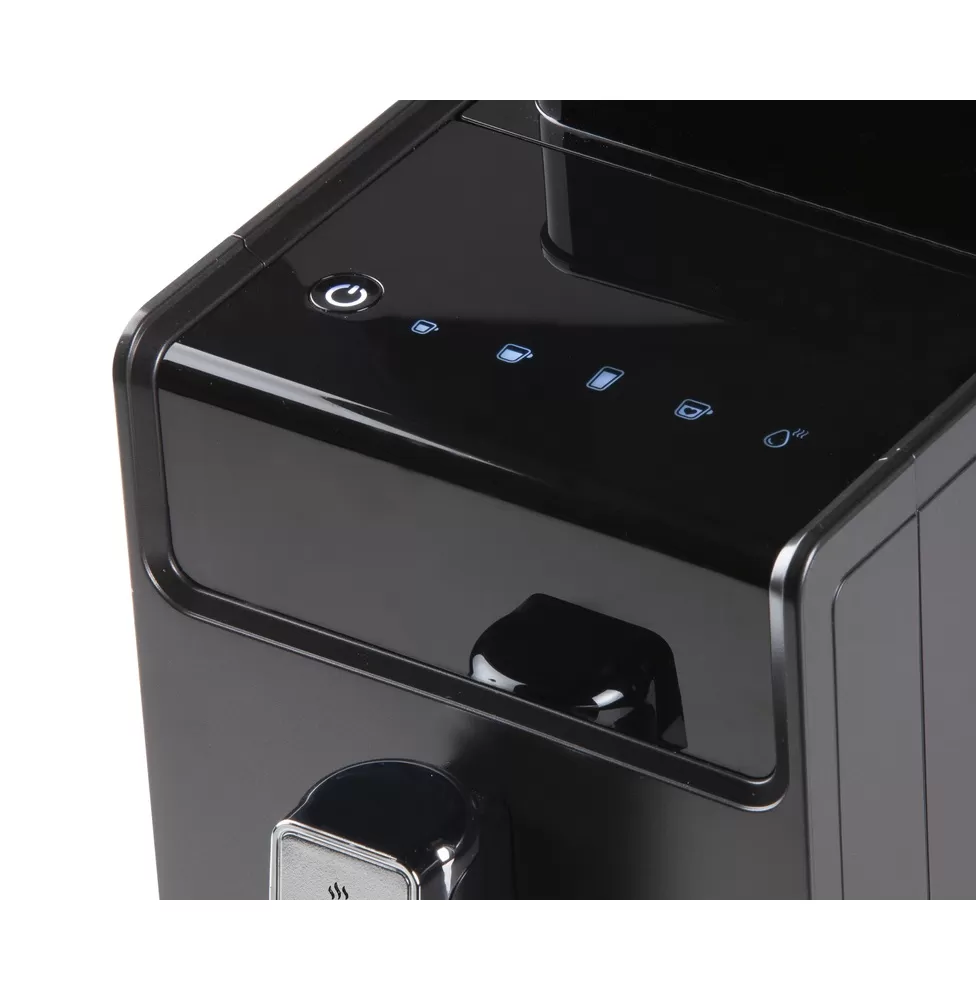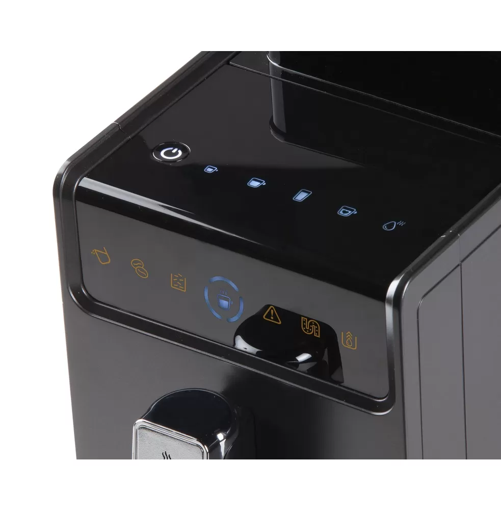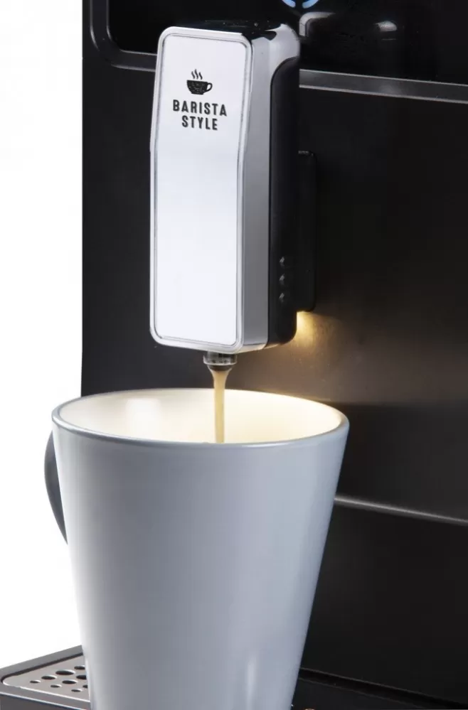 Kompaktní automatický kávovar s volbou objemu šálku 25 až 250 ml, vysokým tlakem až 19 bar, vestavěným mlýnkem a zásobníkem až na 300 g kávových zrn. Funkce předpaření kávy.