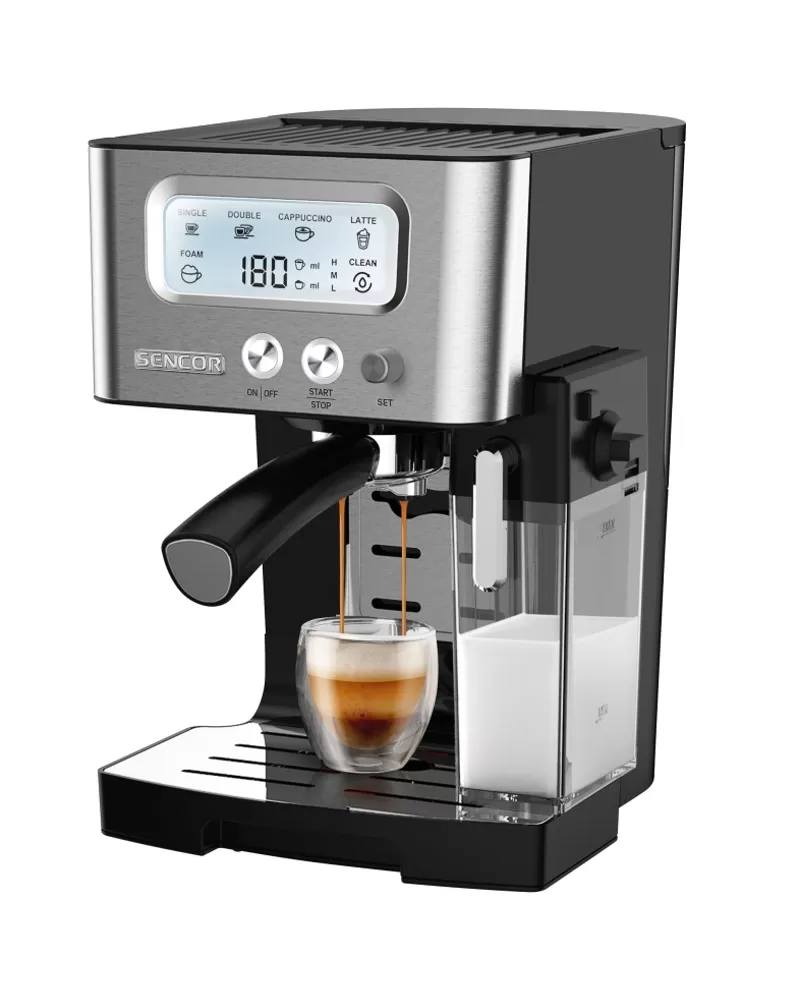 Poloautomatický kávovar Sencor SES 4090SS potěší každého milovníky kávy. Stisknutím jediného tlačítka si totiž s přehledem připravíte chutné espresso, cappuccino i latte. O komfortní ovládání se postará přehledný LCD panel. Zařízení obsahuje čerpadlo s tlakem 15 barů, technologii Thermoblock a systém předspaření.