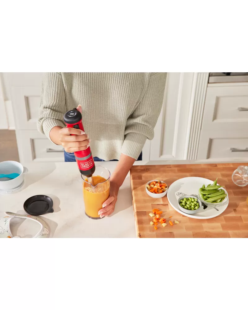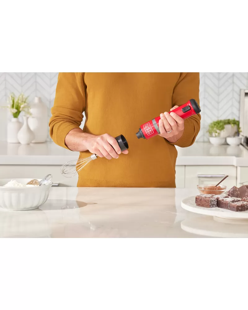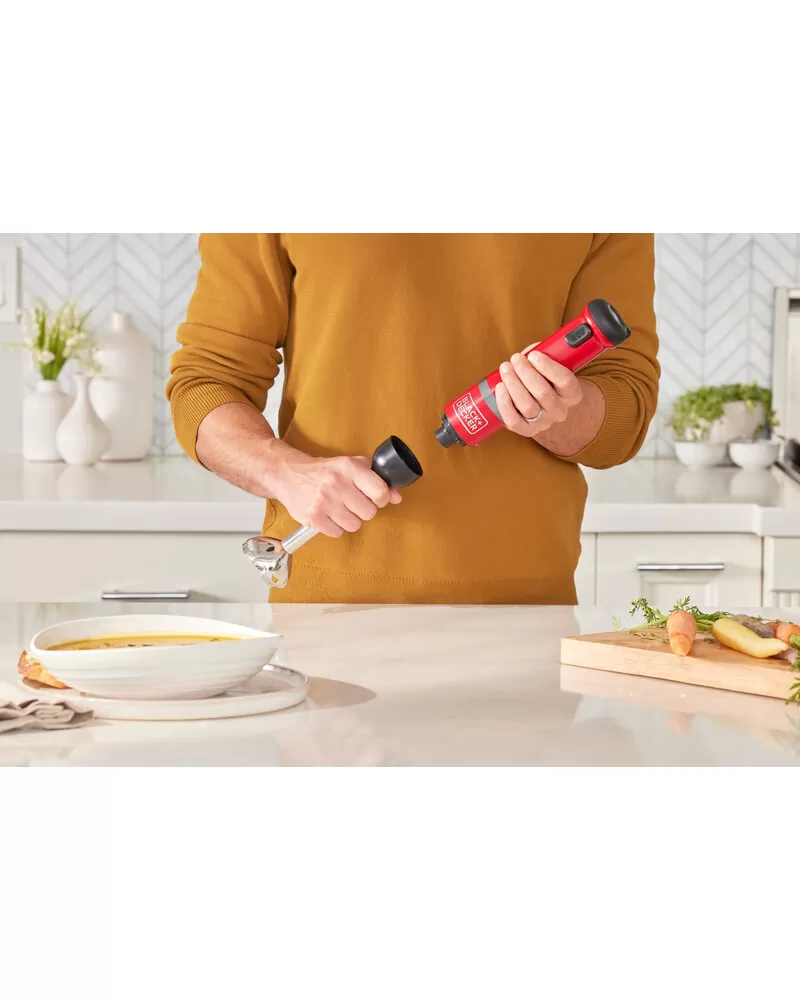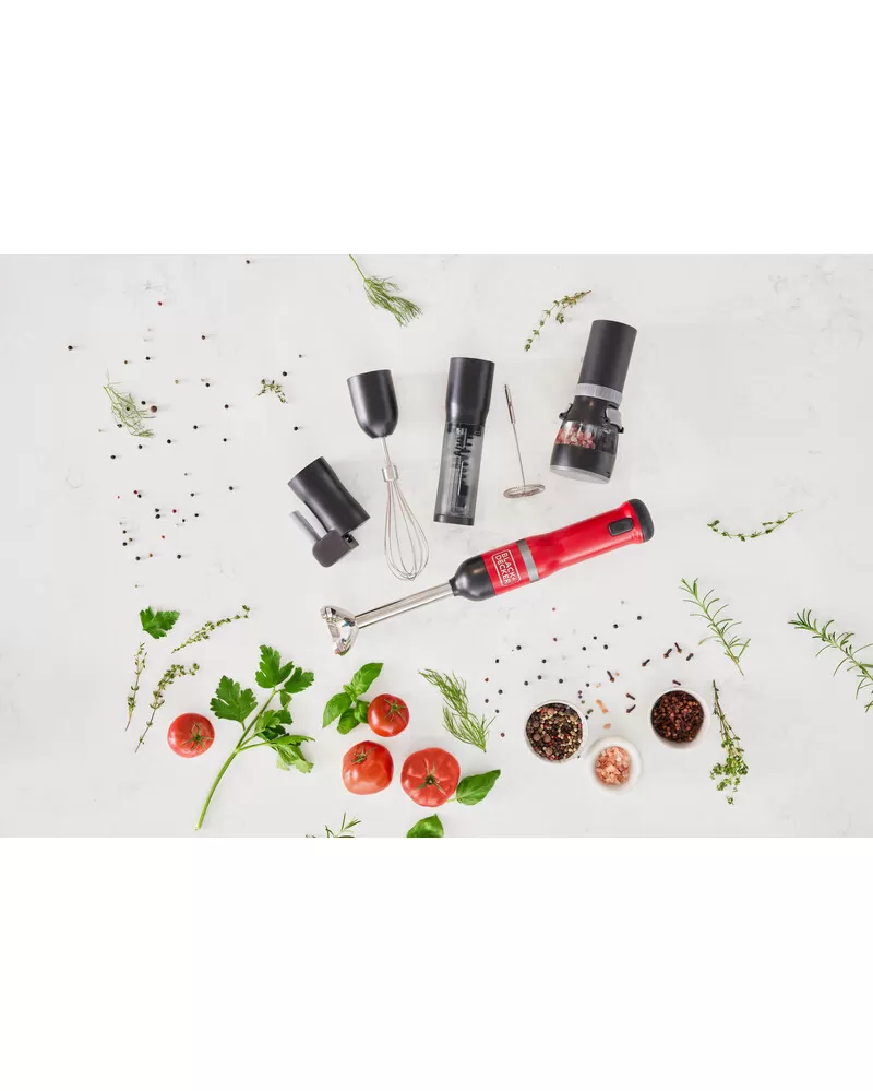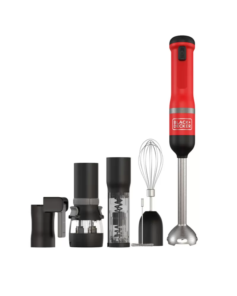 • S nástavcem ponorného mixéru, šlehacím nástavcem, nástavcem drtiče koření, nástavcem otvírače lahví s vínem a napěňovacím nástavcem a také 700ml odměrkou je tyčový mixér BLACK+DECKER vaše všestranné, prostorově úsporné snadno čistitelné kuchyňské víceúčelové nářadí typu vše v jednom, které vám umožňuje zvládat více práce při vaření a pečení s menším úsilím