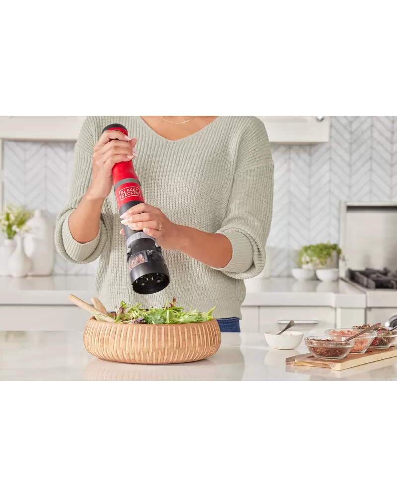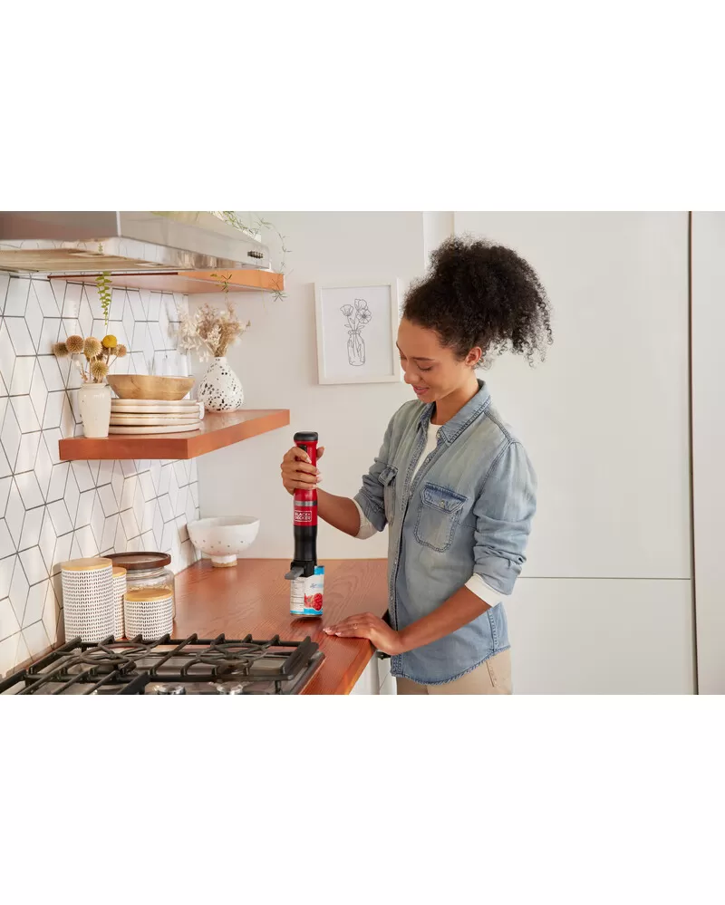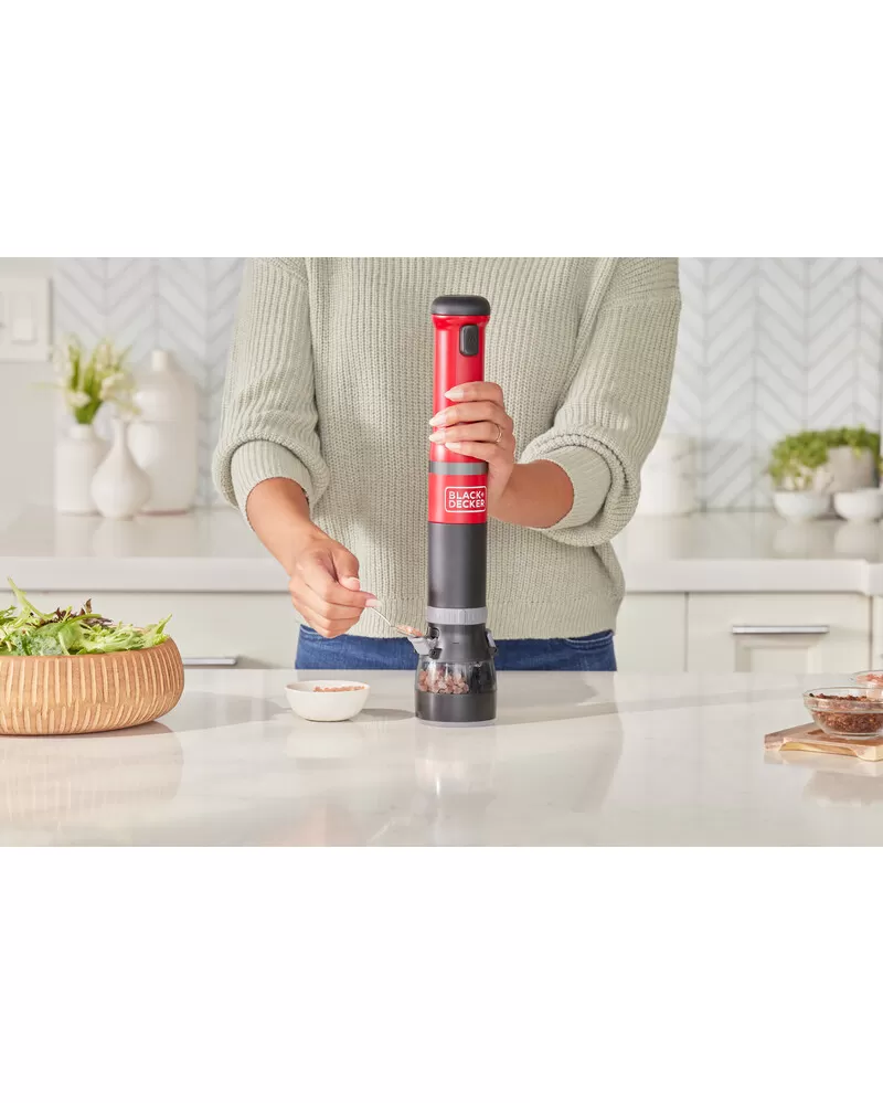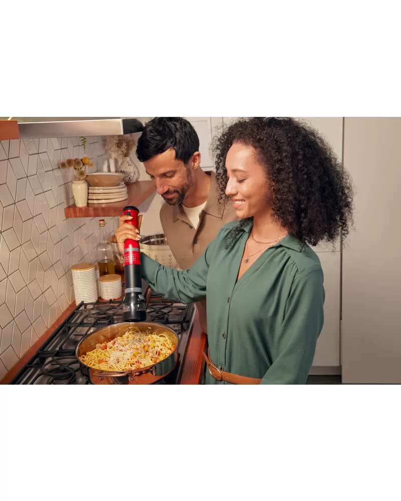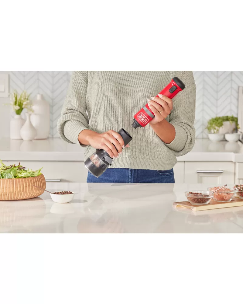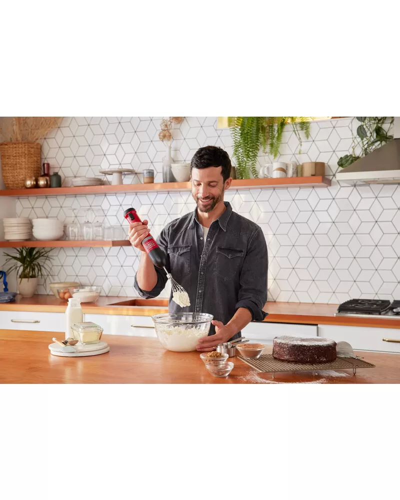 • S nástavcem ponorného mixéru, šlehacím nástavcem, nástavcem drtiče koření, nástavcem otvírače lahví s vínem a napěňovacím nástavcem a také 700ml odměrkou je tyčový mixér BLACK+DECKER vaše všestranné, prostorově úsporné snadno čistitelné kuchyňské víceúčelové nářadí typu vše v jednom, které vám umožňuje zvládat více práce při vaření a pečení s menším úsilím