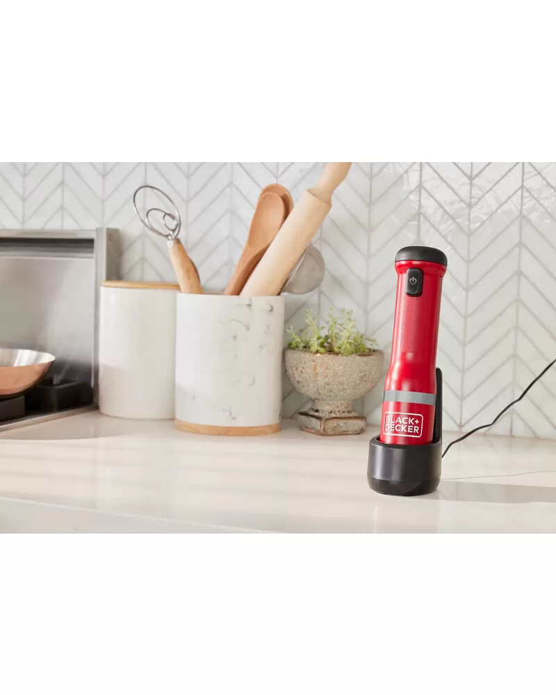 • Tyčový mixér BLACK+DECKER se dodává s praktickým nabíjecím stojanem, jehož součástí je magnetická nabíječka