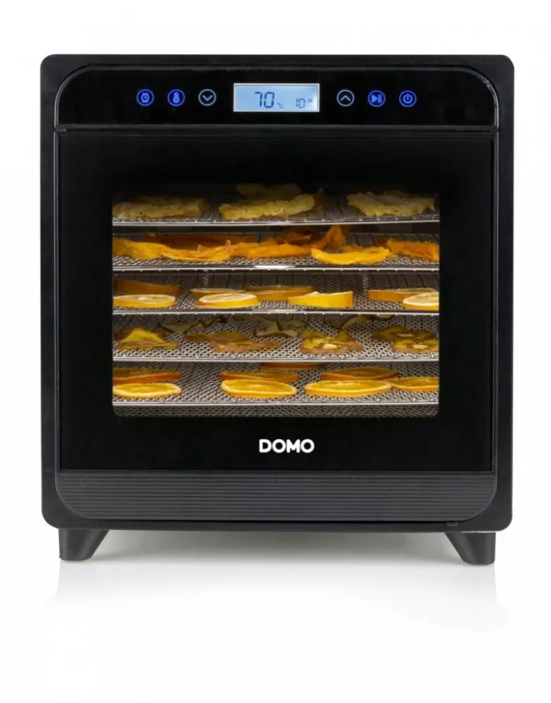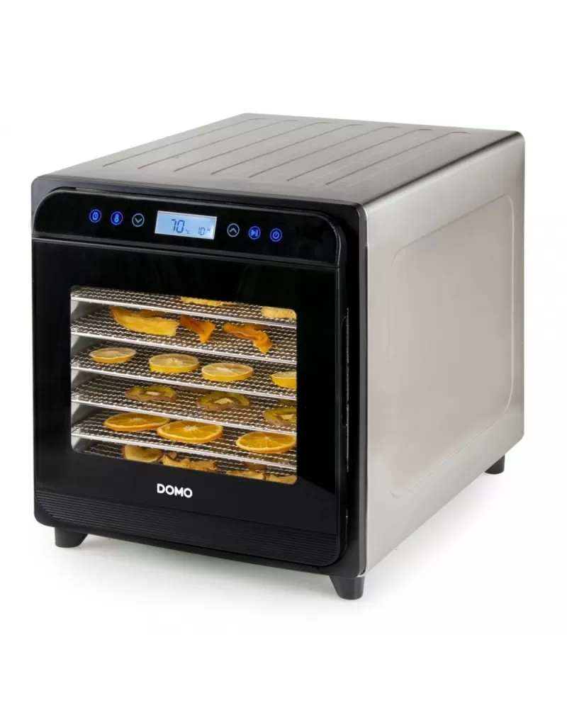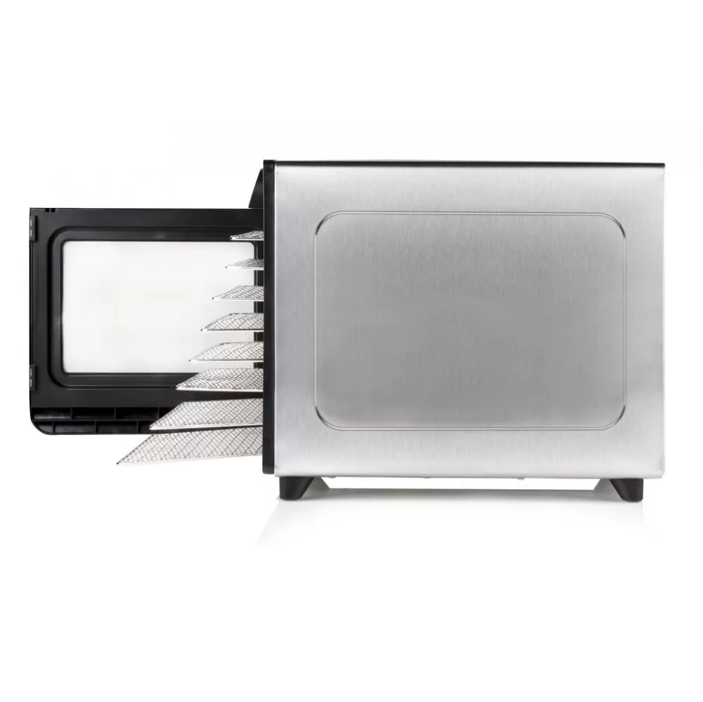 Výkonná a robustní sušička ovoce s tělem z vysoce kvalitního broušeného nerezu vybavená ventilátorem o velkém průměru, přesným digitálním ovládáním teploty a digitálním časovačem. Horizontální rozvod vzduchu zajišťuje rovnoměrné a efektivní sušení v celém objemu sušičky a snižuje hlučnost sušičky na minimum. Zvýšený příkon a rozsah nastavení teploty sušení umožňuje v sušičce efektivně sušit bylinky, ovoce s vysokým podílem vody, maso, nebo na speciálním platu bez otvorů i ovocné placky.