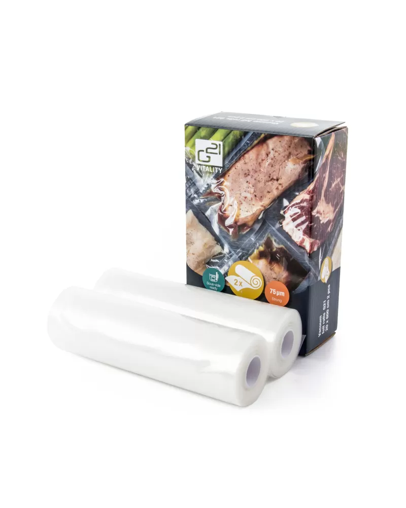 • Pevná potravinářská fólie G21 v 6metrové roli o šířce 20 cm je díky své vysoké pevnosti a kvalitnímu provedení vhodná nejen pro prodloužení trvanlivosti potravin vakuováním a jejich uchovávání v ledničce nebo v mrazáku, ale využijete ji i k vakuování surovin pro sous-vide vaření.
