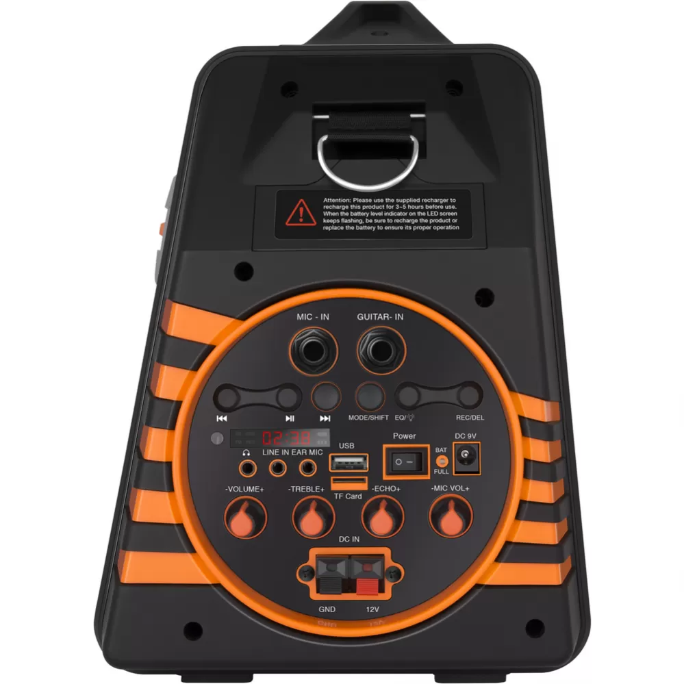 Dětský reproduktor SSS 3200 KIDS je vyvinutý na míru pro všechny děti, které mají rádi hudbu a zpěv. Je ideální řešením na dětské oslavy, dětská hřiště nebo jen tak na hraní. Díky vestavěné dobíjecí baterii o kapacitě 1800 mAh zvládne přehrávat hudbu až 5 hodin při střední úrovni hlasitosti. O kvalitní zvuk se stará jeden středový a jeden výškový reproduktor s maximálním výkonem 30 W. Svojí oblíbenou hudbu si můžete pouštět pomocí bezdrátového rozhraní Bluetooth s dosahem až 15 metrů, z USB klíčenky, harddisku, SD karty nebo z jiného zařízení pomocí 3,5 mm konektoru Jack. Reproduktor je osvětlen vícebarevnou LED diodou pro navození té správné atmosféry. Právě přehrávanou hudbu z AUX vstupu nebo FM rádia a zpěv, lze zaznamenat na médium připojené k zařízení. Balení obsahuje drátový mikrofon, popruh na přenášení a 3,5mm Jack kabel.