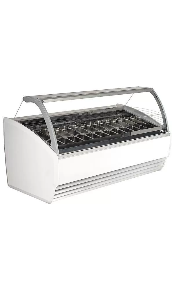 ventilované chlazení|vestavěný agregát|opláštění MDF|LED osvětlení - barva bílá teplá|digitální termostat|automatické odtávání|automatické odpařování kondenzátu|noční roleta|kolečka|čelní a boční vyhřívaná skla - stříbrný sítotisk|model BT 24 - spojeny 2 modely BT 12 - 2 nezávislé chladicí okruhy|GN nejsou součástí|nerezová odkládací plocha|maximální teplota okolí +30 °C a vlhkost 55 % Distributor zmrzliny, kapacita 24 gastronádob.