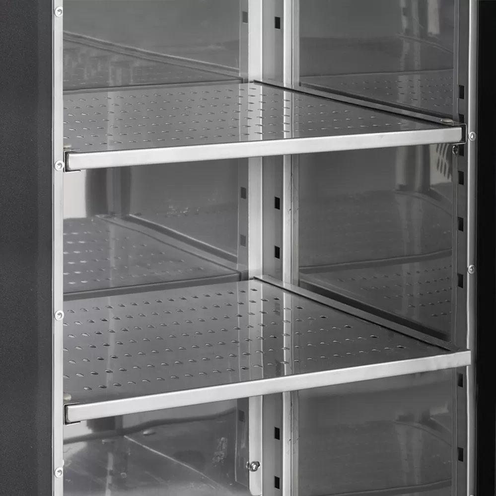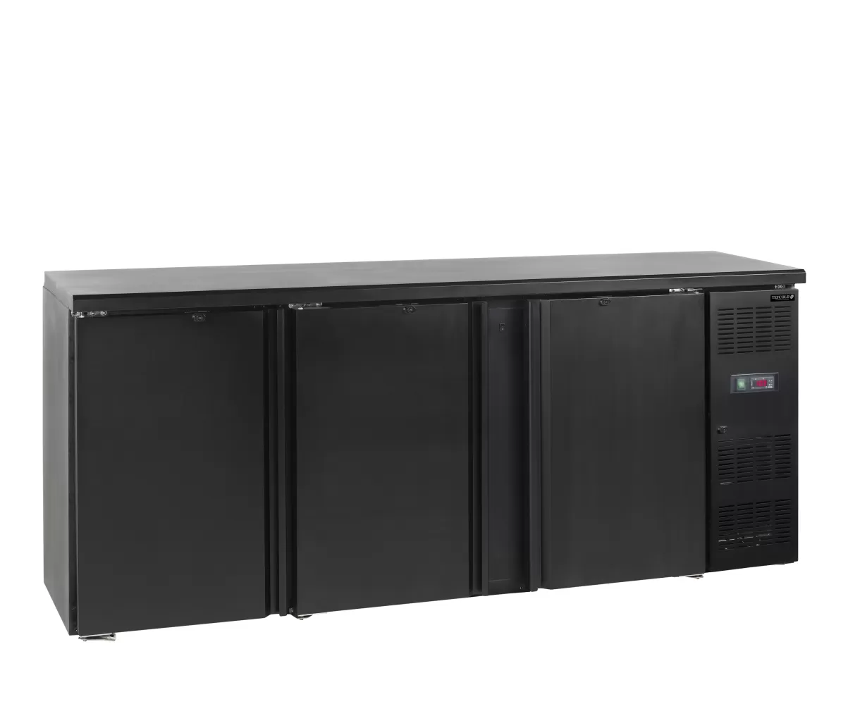 Chladicí minibary TEFCOLD CBC jsou oblíbené pro svůj elegantní vzhled, robustní poctivé provedení a variaci možností, co se velikosti týče. Křídlové dveře jsou samozavírací, plné a vyhřívané, k dispozici jsou také s prosklenými dveřmi (označení G jako "glass" - sklo). Vnitřní prostor je krásně viditelný díky LED osvětlení, které je u moderních minibarů samozřejmostí. Výšku minibaru je možné regulovat pomocí nastavitelných nožek. odolné zařízení do náročného provozu|samozavírací dveře|nerezový interiér|nastavitelné nerezové police SS304|nastavitelné nožky|ventilované chlazení|zásuvky jsou volitelné Minibar se třemi plnými křídlovými dveřmi, barva černá