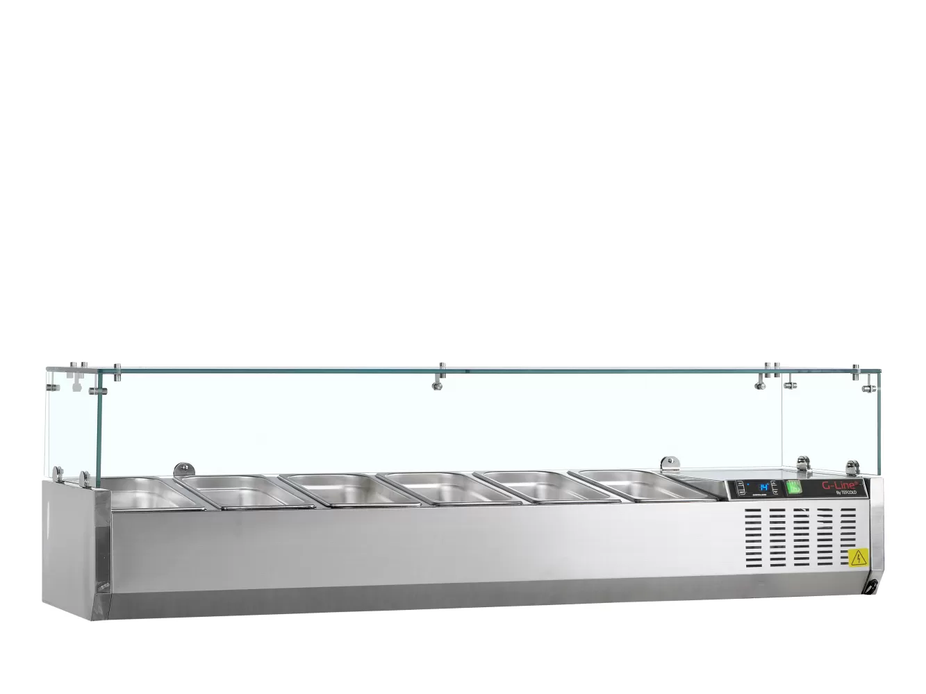 Chladicí nástavba na gastronádoby GN 1/4 vhodná pro pizzerie, rychlá občerstvení či menší provozovny. Gastronádoby nejsou součástí. GVC33-120: 5 x GN 1/4 GVC33-150: 7 x GN 1/4 GVC33-180: 9 x GN 1/4 GVC33-200: 10 x GN 1/4 nerezová ocel|skleněné krytí na ochranu potravin|lze vložit GN1/4 (nejsou součástí balení)|digitální termostat a teplotní displej|statické chlazení|nastavitelné nožky Stolní chladicí nástavba GN1/4