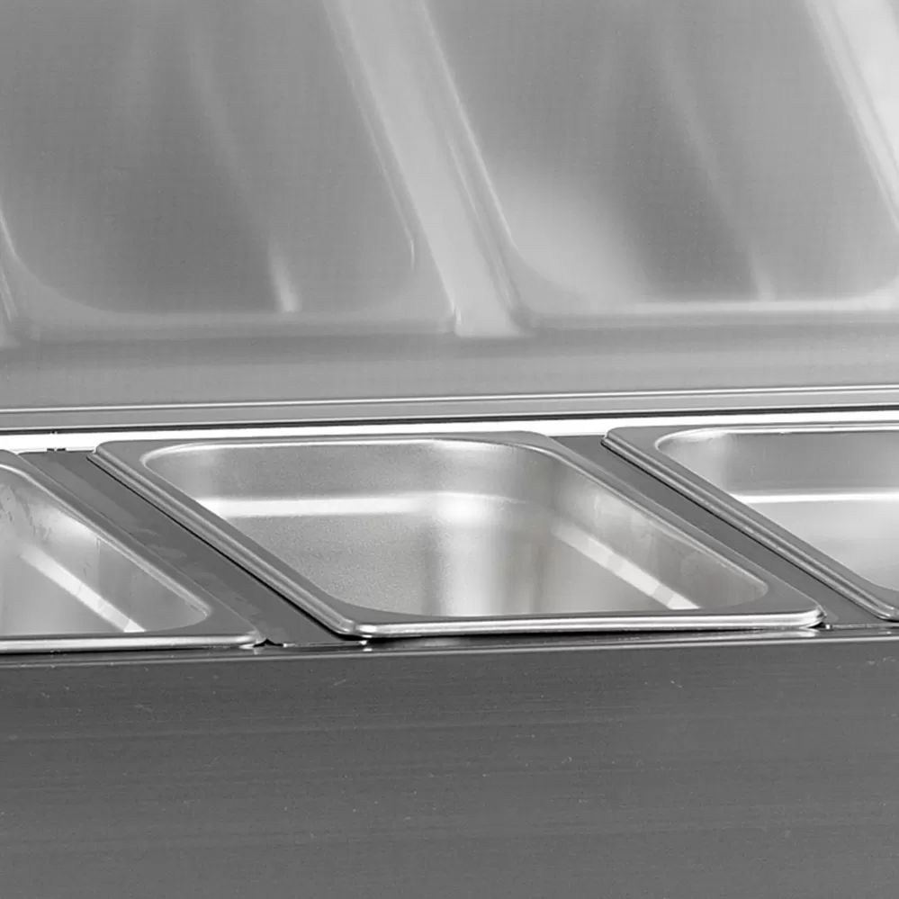 Řada chladicích nástaveb GVC38 S/S je skvělým doplňkem gastro pultů, protože vám umožňuje mít na dosah vše, co potřebujete k přípravě jídla. Je vhodná pro gastronádoby GN 1/3 a GN 1/2 x 150 mm (nejsou součástí) GVC33-120: 4 x GN 1/3 nebo 3 x GN 1/3 + 1 x GN 1/2 GVC33-150: 6 x GN 1/3 nebo 5 x GN 1/3 + 1 x GN 1/2 nerezové víko|nerezová ocel|přizpůsobeno GN1/3 (nejsou součástí balení)|digitální termostat a teplotní displej|statické chlazení|nastavitelné nožky Stolní chladicí nástavba