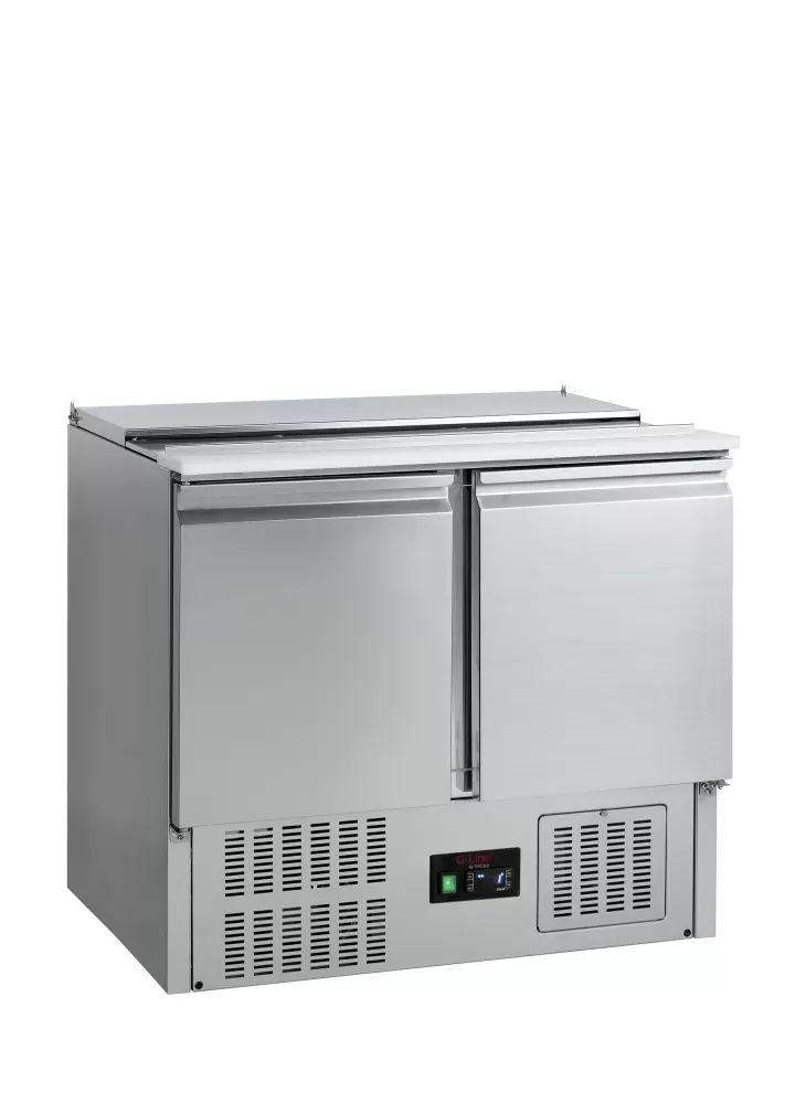Saladeta v kompletním nerezovém provedení prověřená kvalita za příznivou cenu|polypropylenová krájecí deska|vhodné pro gastronádoby (nejsou součástí)|automatické odmrazování|nastavitelné police GN 1/1|nastavitelné nožky|nerezové provedení|chlazení s pomocným ventilátorem Saladeta dvoudveřová v kompletním nerezovém provedení (náhrada za NORDline GN 100 SA new).