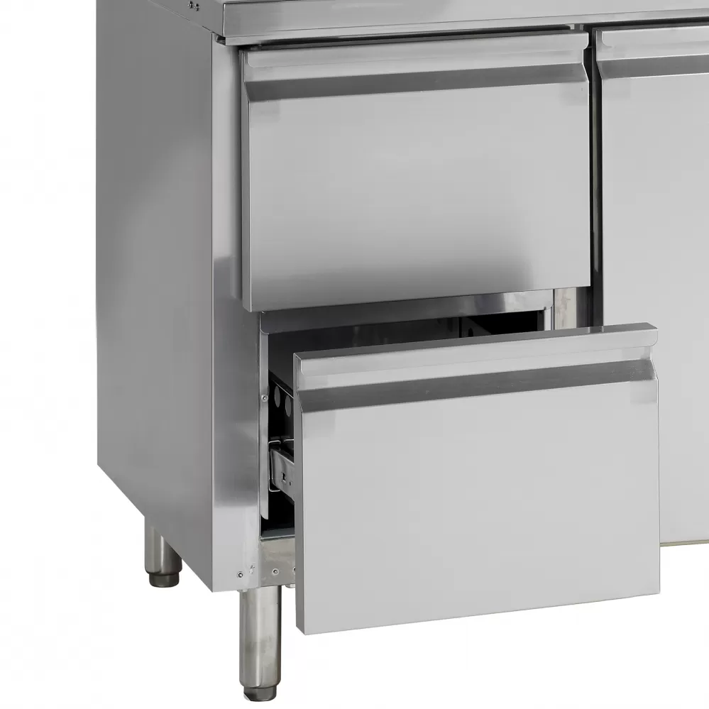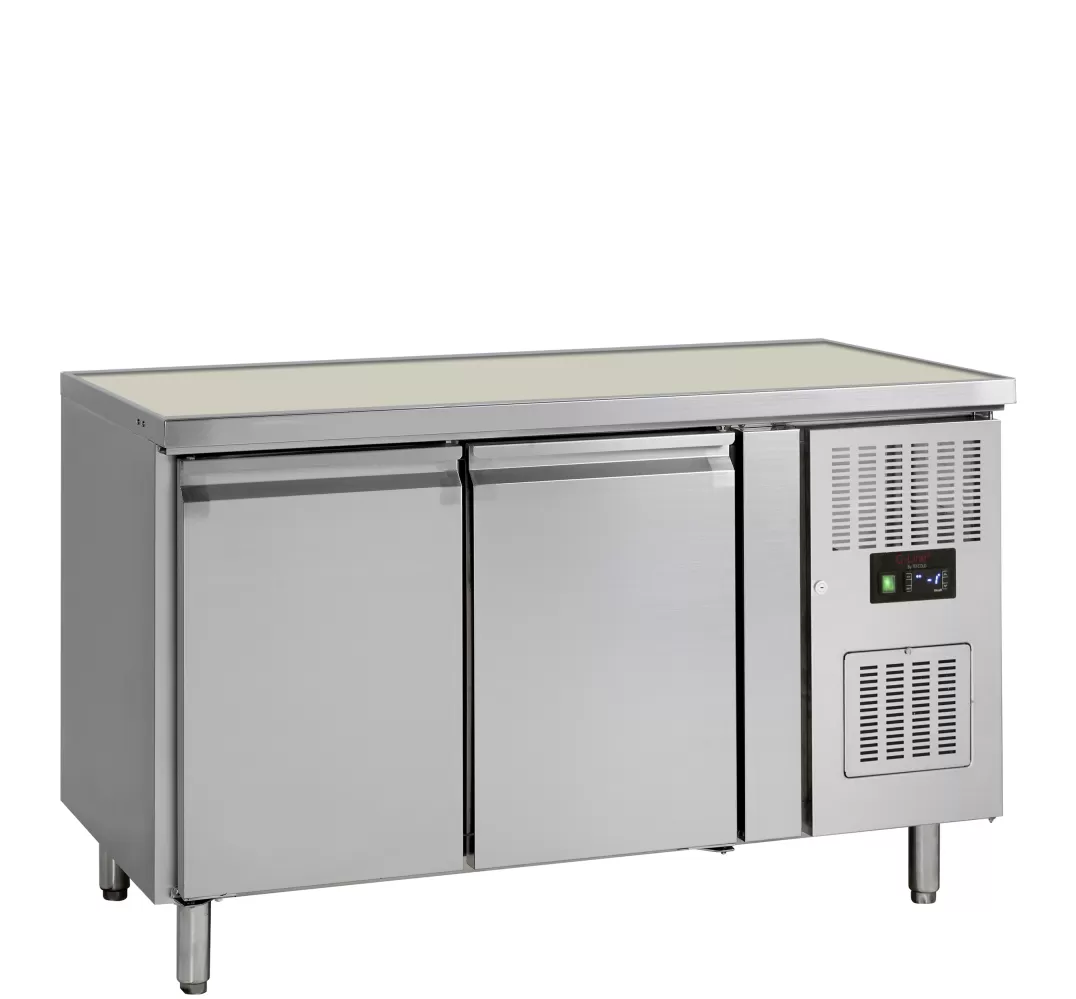 Tyto chladicí nerezové stoly se dodávají standardně bez desky, která lze dokoupit na objednávku s lemem, bez lemu, se dřezem vlevo nebo vpravo. Agregát je rovněž možné zvolit na pravé nebo levé straně. Stůl má standardně samozavírací dveře, ale je možné je nahradit 1/2 zásuvkami (kód 12546). V každých dveřích je nastavitelná roštová police GN 1/1. ventilované chlazení|automatické odtávání|digitální termostat|digitální ukazatel teploty|kompletní nerezové provedení|nucený oběh, který zajistí nastavenou teplotu i při vyšší četnosti otevírání|neoddělený vnitřní prostor|samozavírací dveře|nastavitelné police|nastavitelné nožky Chladicí stůl bez desky (náhrada za NORDline GN TN univerzal bez desky)