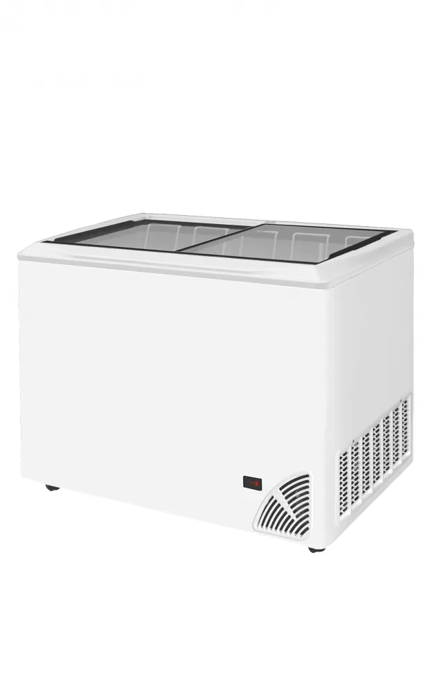 Prosklené mrazničky Byfal jsou k dostání ve třech bravách: červená, šedá, bíla a ve dvou provedeních: s rovným víkem a oblým víkem. Vyznačují se vynikajícími izolačními vlastnostmi. Vnější plášť je vyroben z pozinkovaného plechu, ten je z vnější strany potažen PVC, což jej činí odolnější proti korozi a poškrábání. Vnitřní stěny mrazničky jsou z Alu plechu o čistotě 99 % mimo dna, to je vyrobeno z ocelového plechu s povrchovou úpravou pro styk s potravinami. Vrchní krytí je z tvrzeného skla s termickou vrstvou,která zajistí lepší izolaci.Víko je opatřeno zámkem. Kompresor řídí digitální termostat s displejem, který znázorňuje aktuální teplotu. Ve standardní výbavě se nachází plný počet košů, do kterých je možno objednat dělící přepážky pro rozdělení mražených potravin. statické chlazení|vestavěný agregát|manuální odmrazování|digitální termostat s teploměrem|síla izolace stěny - 65 mm|bílé opláštění, uvnitř ALU|koše jsou součástí|zámek|kolečka Pultová mraznička s posuvným rovným víkem a digitálním termostatem s teploměrem
