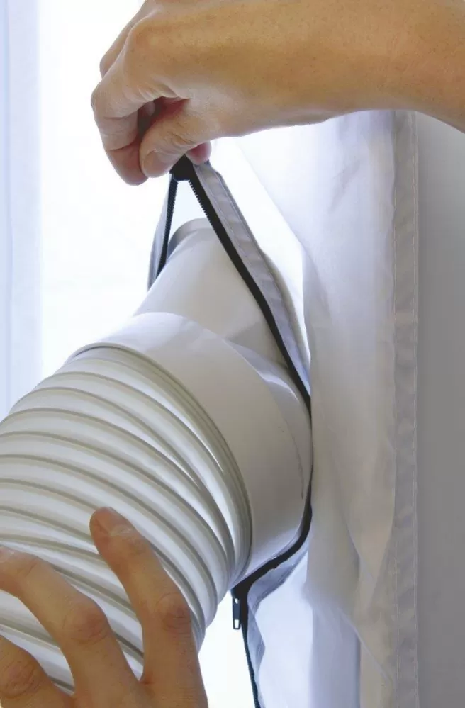 • Integrovaný zip nabízí možnost variabilní polohy výfukové hadice díky těsnění. Na závěr se připojí hadice od mobilní klimatizace