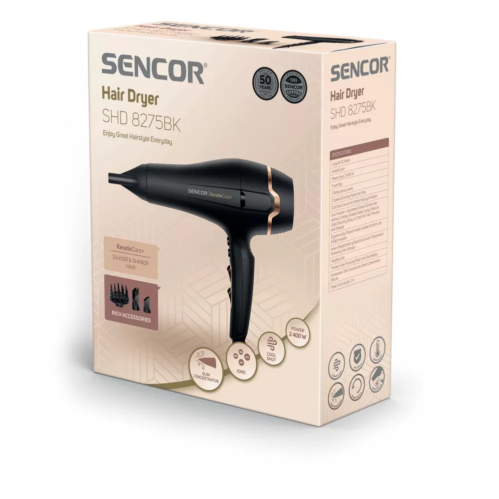 Fén na vlasy SENCOR SHD 8275BK Péče KeratinCare+ Ionizační funkce 3 teplotní a 2 rychlostní nastavení Režim turbo Difusér Hladký koncentrátor… Celý popis