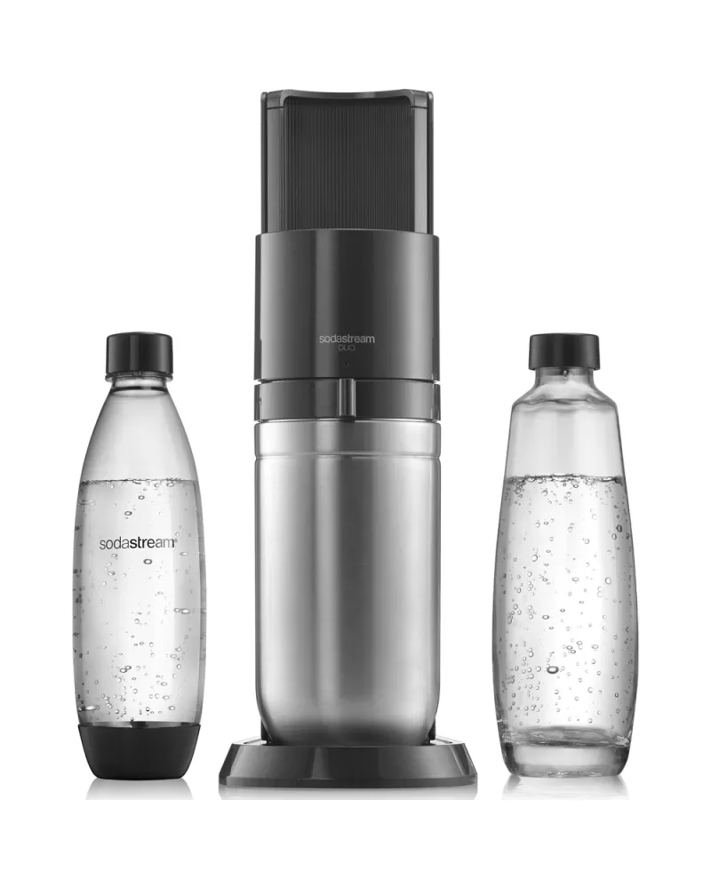 • Nové Duo je prvním výrobníkem perlivé vody SodaStream, který je kompatibilní se stylovými skleněnými i opakovaně použitelnými plastovými lahvemi SodaStream. Zažijte revoluci v přípravě čerstvé perlivé vody a dopřejte si nadstandardně snadnou a pohodlnou obsluhu spolu s praktickými funkcemi, které tato řada přináší. Vzhled výrobníku SodaStream DUO, který vyhrál cenu Red Dot Award za vynikající design si zaručeně získá vaši pozornost. Jeho oblé tělo v lesklé černé barvě s nerezovým držákem na lahve se bude dokonale hodit do každé moderní kuchyně. Vy si tak budete moci připravit váš oblíbený perlivý nápoj z pohodlí vašeho domova pouhým stisknutím ergonomického tlačítka, a to bez spotřeby elektrického proudu či jiných zdrojů napájení.