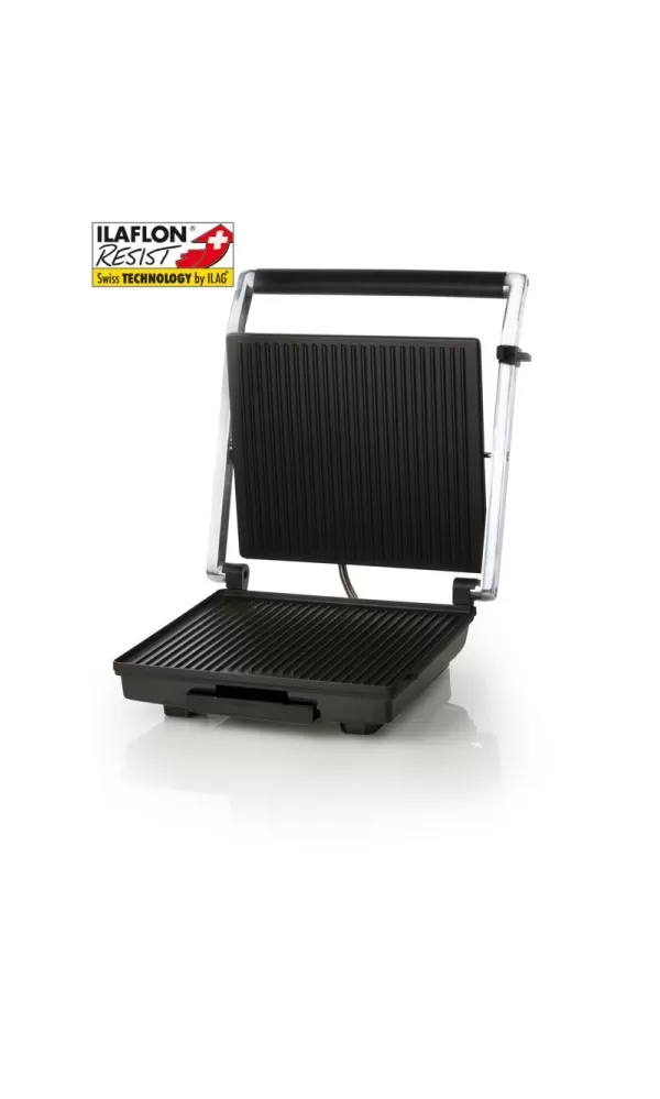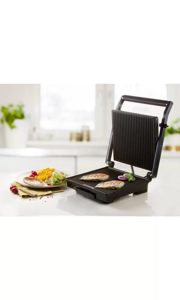 Celonerezový kontaktní gril s nepřilnavým povrchem a nádobkou na tuk. Gril využijete pro přípravu masa, grilované zeleniny i zapečených baget či sendvičů.