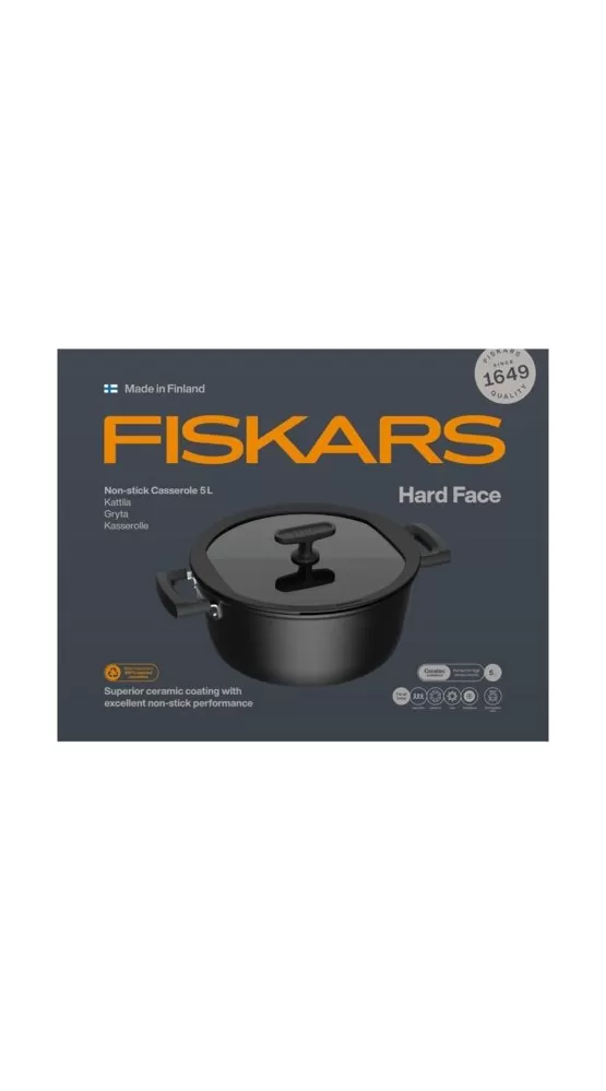 • Hrnec Fiskars Hard Face s nepřilnavým povrchem o objemu 5 l splňuje požadavky pro náročné používání a vysoký žár a zároveň přináší spolehlivé výsledky pro zkušené uživatele