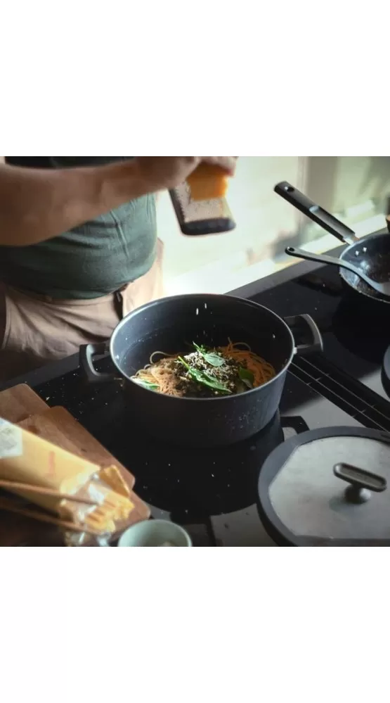 • Průhledná poklička ze žáruvzdorného skla usnadňuje sledování přípravy pokrmů a umožňuje vylévat tekutinu dvěma různými způsoby