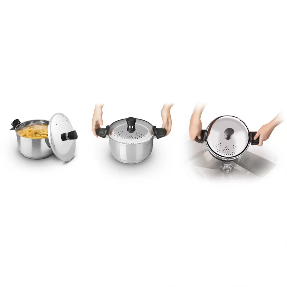 • Poklička s cedícím mechanismem z nerezavějící oceli se speciálním zachycením pomocí výklopných rukojetí pro komfortní cedění těstovin
